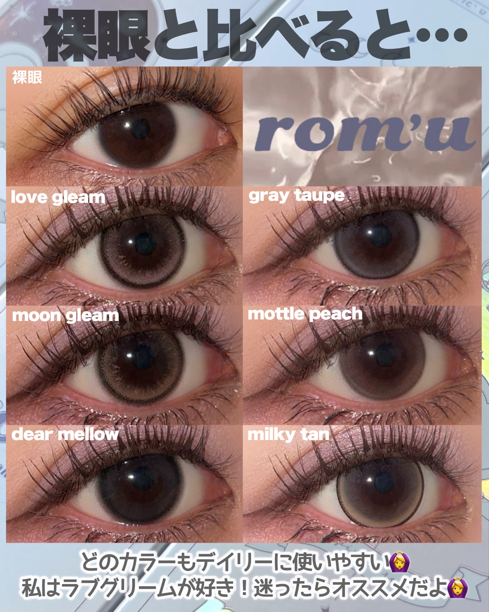 ご閲覧ありがとうございます🍂\新色が登場✨/🩷rom'uepisode0・既存3カラー🩷rom'uから新しくepisode0の3色が発売されたよ✨今日は新色全カラーと既存3カラーの6色レポ📢・れっつとらい。今回IVEのREIさんが新ミューズ👼✔️🆕lovegleamラブグリームDIA14.5mm/着色直径13.6mm/BC8.7mmきらめきを閉じ込めたハイライトデザイン✨瞳に溶け込む甘いピンクブラウンカラー🩷✔️🆕moongleamムーングリームDIA14.5mm/着色直径13.6mm/BC8.7mm瞳にきらめきを宿すハイライトデザイン💫三日月を映したようなベージュカラー🌙✔️🆕dearmellowディアメローDIA14.5mm/着色直径13.6mm/BC8.7mmなめらかなダークグレーとぼかしリング✨吸い込まれるような深みとツヤをプラス!✔️graytaupeグレイトープDIA14.5mm/着色直径13.7mm/BC8.7mm透明感を叶える細フチデザイン🫧パープルがかった深みのあるグレーで儚い瞳に✨✔️mottlepeachマトゥルピーチDIA14.2mm/着色直径13.2mm/BC8.7mm儚いピンクブラウンと細フチは相性抜群🙆♀️溢れ出そうな潤みある瞳を再現🫧✔️milkytanミルキータンDIA14.5mm/着色直径13.7mm/BC8.7mm細ふちリングできゅるんとした瞳🐈⬛淡いアッシュベージュがポイント✨どのカラーもデイリーに使いやすいよ🙆♀️新色三色が私的にめちゃくちゃハマった色で全部かわいいんだけど、迷ってたらラブグリームがオススメ👀!瞳に馴染むやりすぎないピンクがかわいいし、ハイライトで立体感も出せちゃうし派手じゃないのに盛れる👍✨是非チェックしてみてー👍・¨¨¨¨¨¨¨¨¨¨¨¨¨¨¨¨¨¨¨¨¨¨¨¨¨¨¨¨¨¨¨rom'uepisode0・既存3カラー¨¨¨¨¨¨¨¨¨¨¨¨¨¨¨¨¨¨¨¨¨¨¨¨¨¨¨¨¨¨¨#PR#romu#ロミュ#IVEREIミューズ#romuシグネチャーデザイン#きらめく#星屑ハイライトレンズ#カラコンレポ#Qoo10メガ割