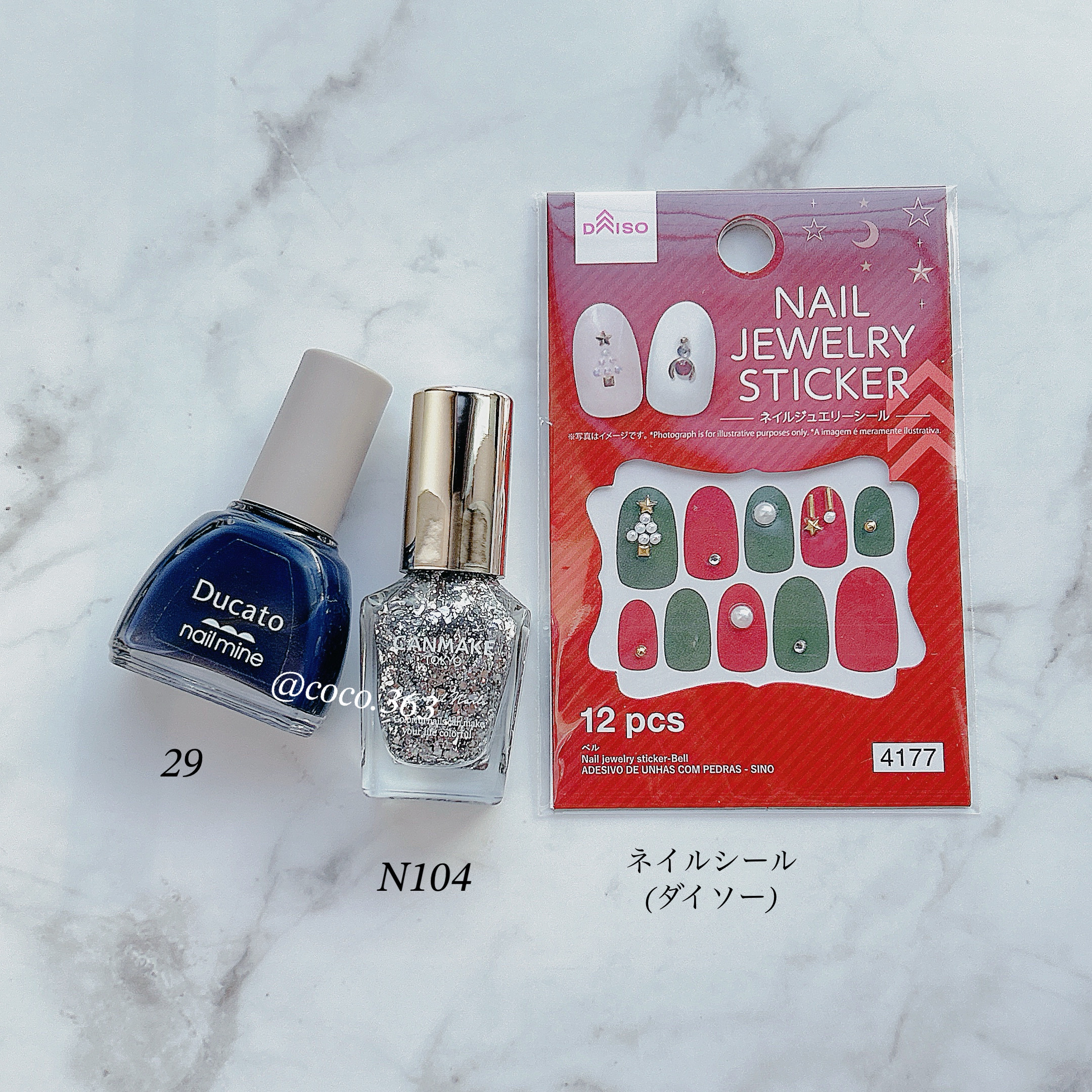 ダイソーのネイルシールを貼るだけ超簡単💅🏻大人シックなクリスマスネイル*↟⍋*↟♡︎︎︎︎︎︎☑︎つくり方等は2枚目からの画像でどうぞ🎄の形になっているダイソーのネイルシールを貼るだけで簡単にホリデー気分な爪先に🫶🏻〚29ブルーデニム〛シアーでちゅるんとした仕上がりの絶妙なくすみブルーが好きすぎた🥹💕ネイルのまとめは↓↓↓からどうぞ♡#cocoデュカートネイル#cocoキャンメイクネイル#coco100円ネイルデュカートネイルマイン¥495〚29ブルーデニム〛キャンメイクカラフルネイルズ¥396〚N104スペースシップ〛ディーアップストロングガード¥1,430ディーアップクリスタルクリアトップコート¥1,430#デュカートネイルマイン#キャンメイク#キャンメイクカラフルネイルズ#キャンメイクネイル#100均ネイル#クリスマスネイル#冬ネイル#冬ネイルデザイン#ネイルデザイン#簡単ネイル#ちゅるんネイル#簡単ネイルデザイン#プチプラネイル#大人ネイル#シンプルネイル#セルフネイル#ネイル#ポリッシュ#ネイルポリッシュ#マニキュア#selfnail#nail#美甲#네일#垢抜ける#垢抜ける方法#垢抜けアイテム#お役立ち美容ツール