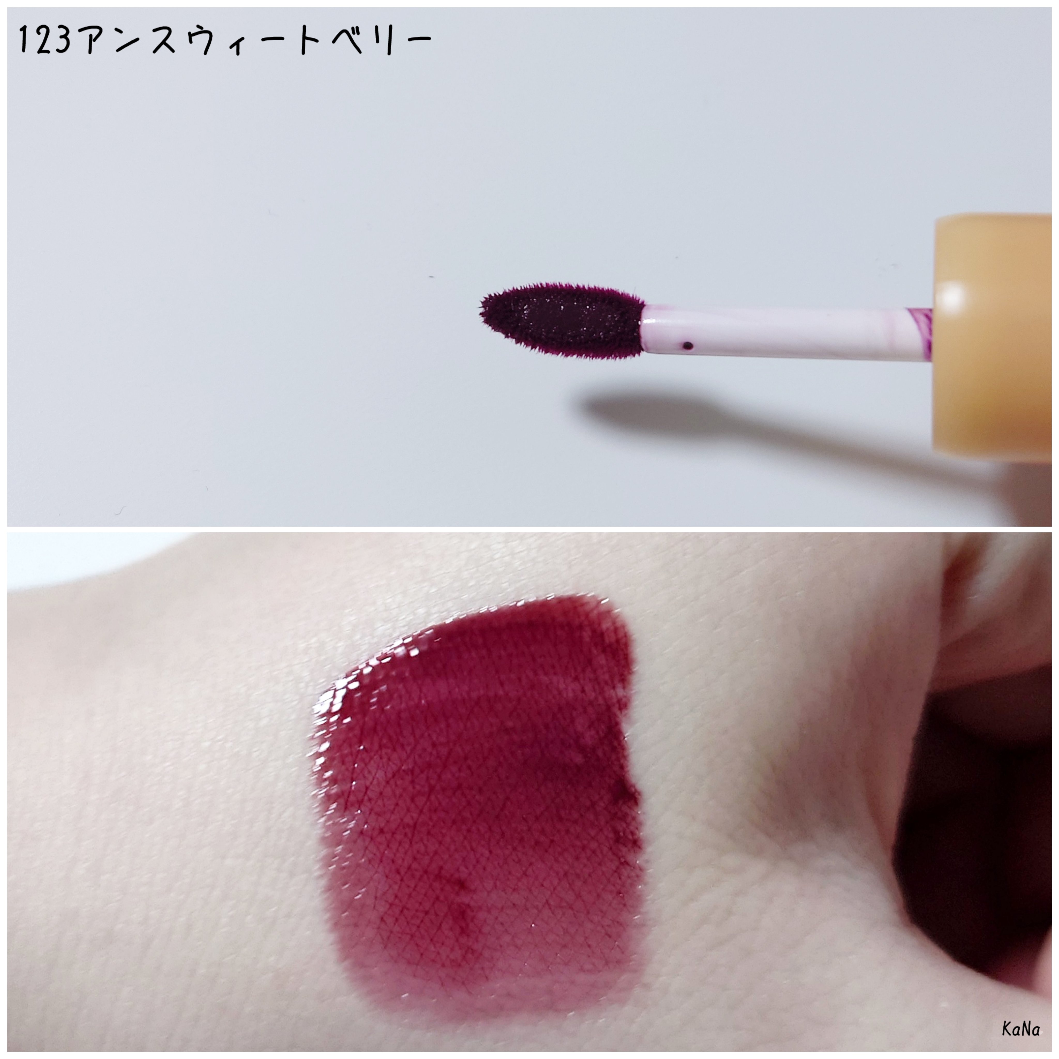 たくさんのカラーバリエーションがある中で、私は123 アンスウィートベリーを使っています。ぶどうのような濃いめのパープルです。 サラサラとしたテクスチャーで、薄くも塗ることができます。ツヤ感が出てくれるし、色モチもよく感じました。 パッケージもかわいいし、持ち歩きにもピッタリな大きさです。フルーティーな香りも楽しめて、おすすめです。