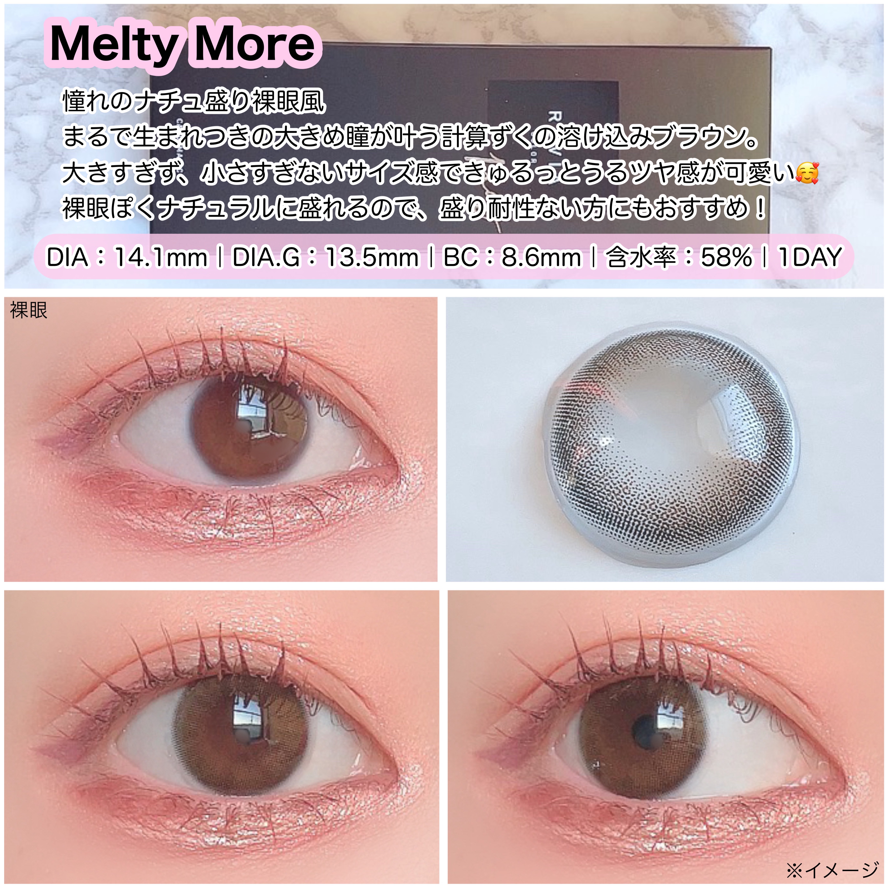 こっそり盛れる裸眼風カラコンだよ!! メルティベアの進化系🧸 メルティモアが登場! 焦げ茶カラーだからどんな瞳の色の方でも馴染みやすいし裸眼が一回り大きくなったような自然な仕上がりでデイリー使いにぴったりだよ!!😆✨