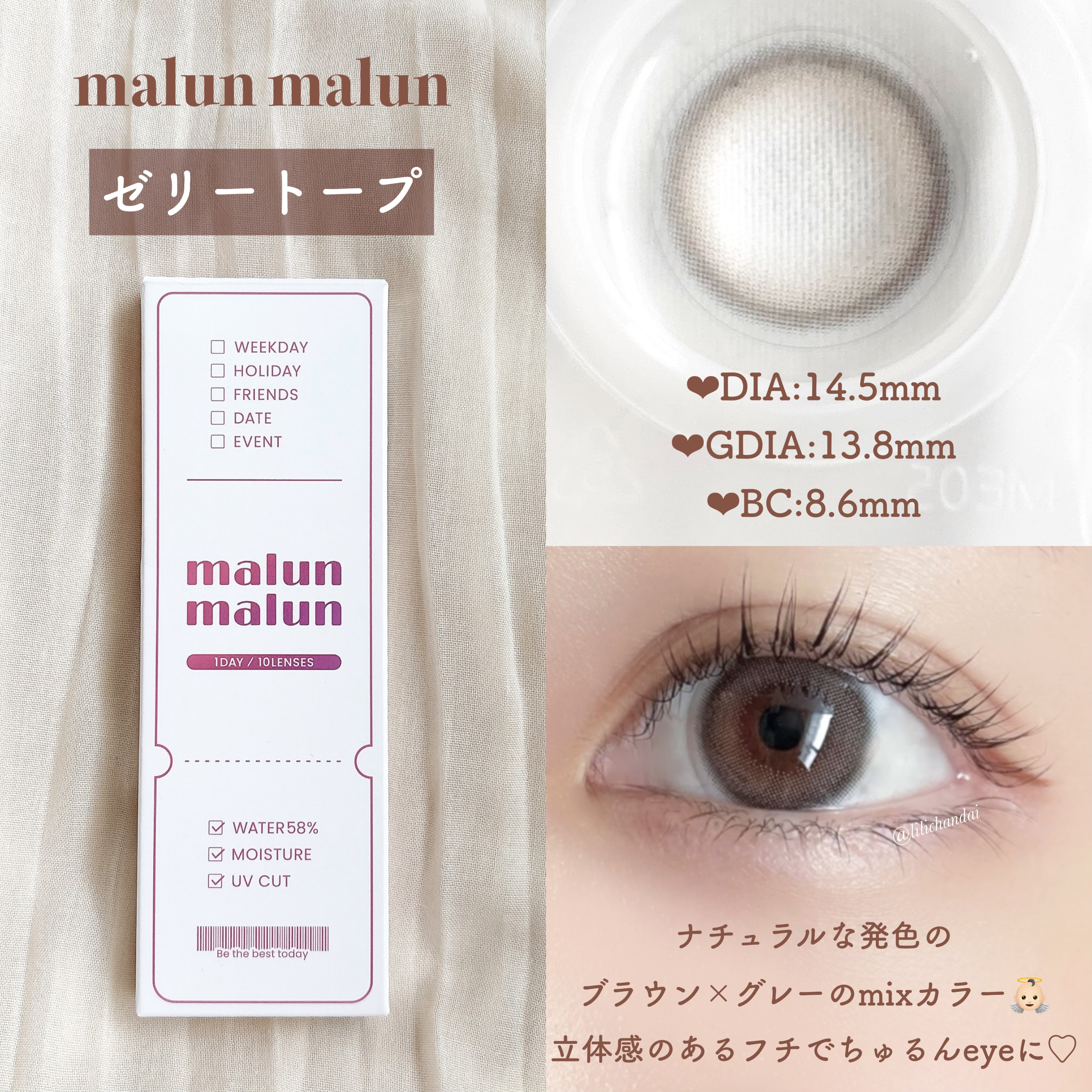 純度の高いガラスのような、品格を醸し出すレーシィな発色。 瞳を透明感で満たすエレガントなティントブラウン。 個人的にとってもすきな発色でした🥰 目に光が入ってちゅるんちゅるん🥹 モテカラコンだと思います🫶🏻 他の2色もレポしてるので良かったら見てください🩵