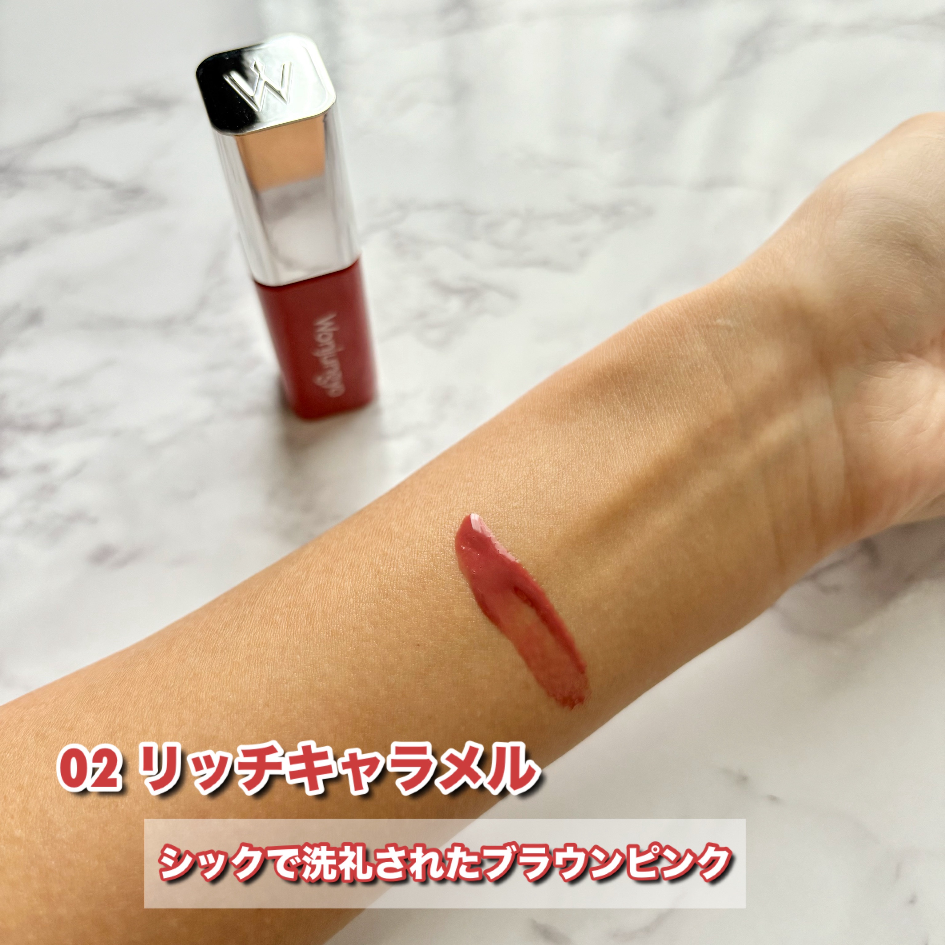 \うるツヤリップ👄💖/大人気ウォンジョンヨのリップティントを購入!!💗中でも個人的に1番好きだったのが、02番のリッチキャラメル🐻🩷手に塗ると深みのあるピンクブラウンって感じだけど、唇に塗ってみるとピンクベージュ?っぽさを感じた!重ね塗りす...