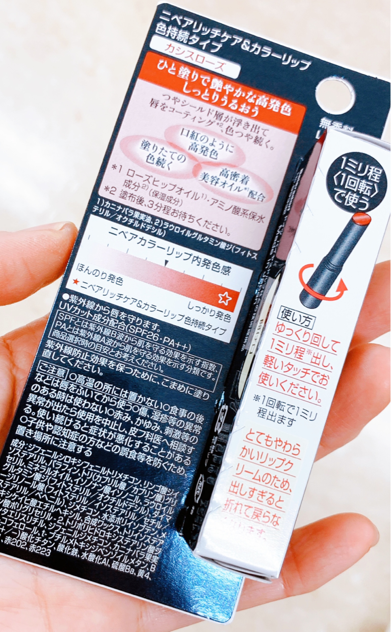 ニベアリッチケア&カラーリップ色持続タイプカシスローズです色持続効果もあり、リップケアできるというのが気になり購入✨高密着美容オイル配合、SPF26PA++です🙆🏻♀️リップクリームですが、高発色で血色感のある仕上がりになりました☺️色持ちについては、さすがに食事をすると取れてしまいました😖飲み物だけなら大丈夫かも?🤔もう少し色持ちするかなと思っていたので、こちらの評価とさせていただきます🙇🏻♀️