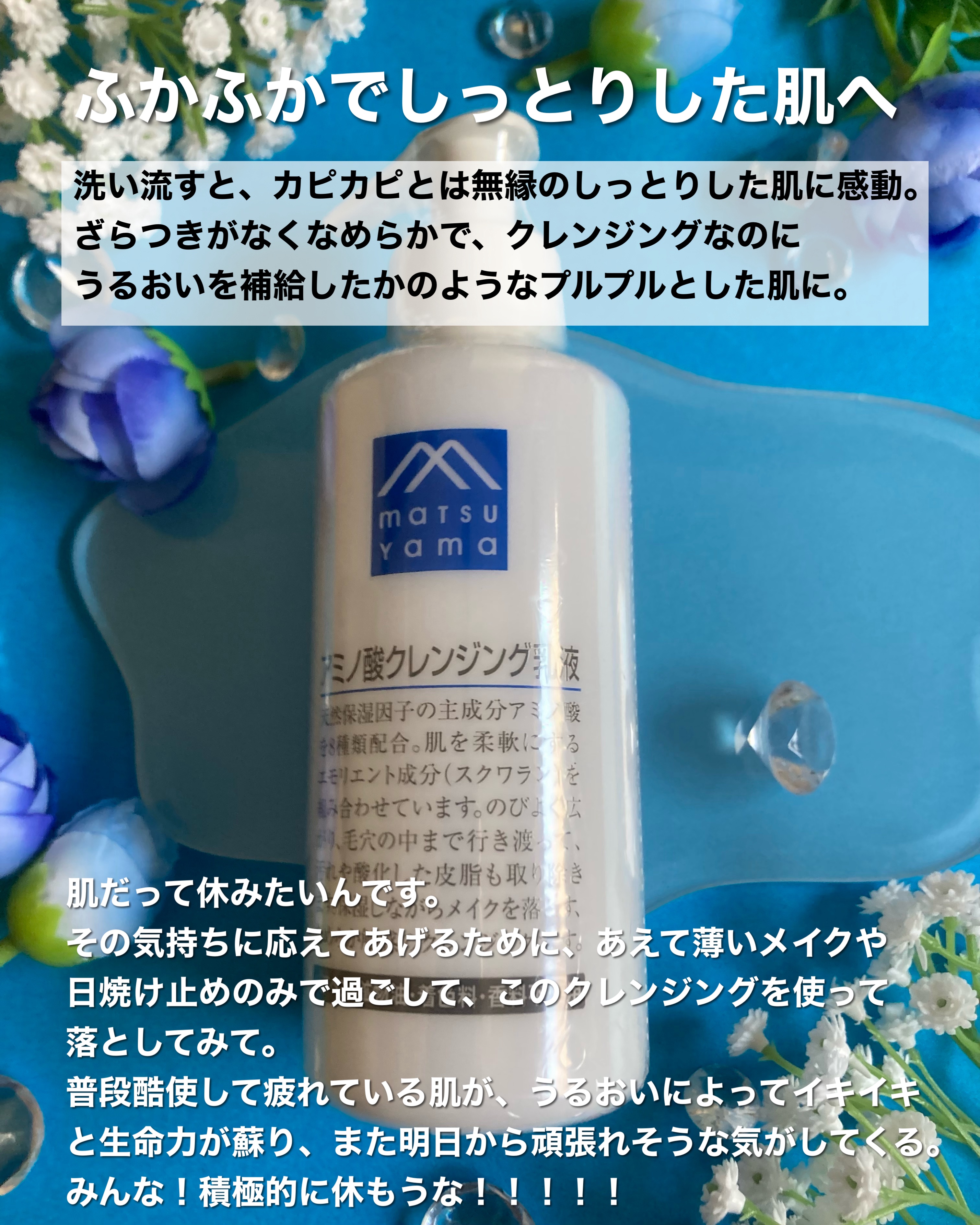 #肌荒れ予防計画肌荒れしてても使いやすい💗松山油脂Mマークシリーズアミノ酸クレンジング乳液乳液タイプのメイク落としなんだけど、クレンジングじゃなくて本当の乳液みたい😳とろみがあって、乳液みたいなテクスチャー🤍お肌への伸びもよくて、クッション性...