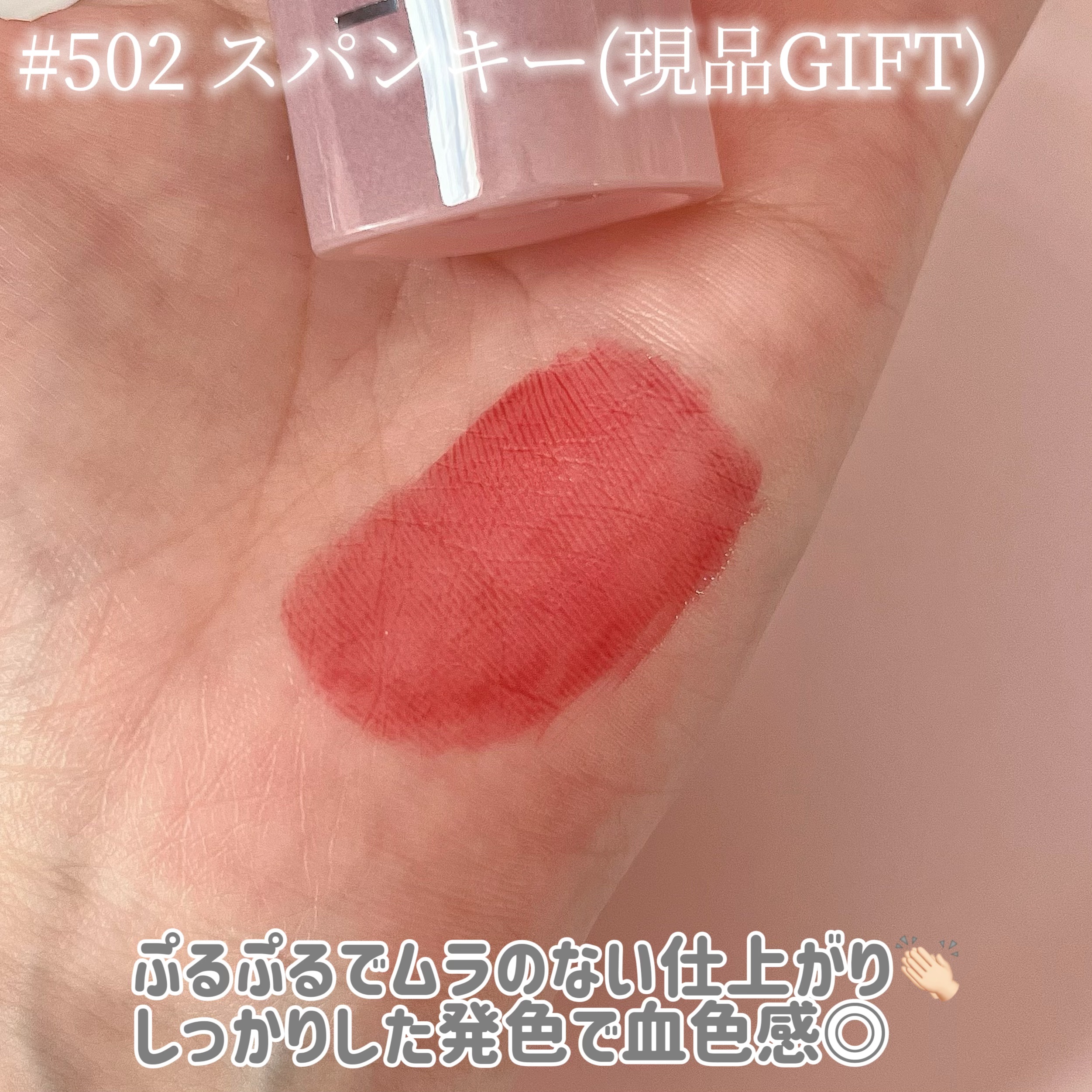 透け感たっぷり みずみずしいテクスチャーのウォータリーティント。 502 Spunkyの鮮やかな色味と合わせたとき、ムラになりやすくて綺麗にのらなかった😭 フルーティーグラムティントとジェリーイングヌードグロスの方が個人的には好み…!