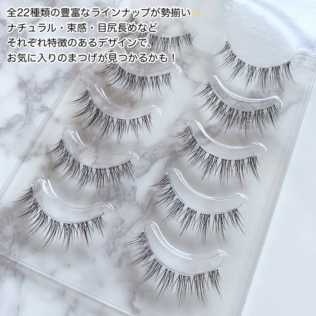 流行りの束感まつげもつけまを付けるだけでゲットできちゃうから気分に合わせて毎日を楽しんじゃお🥰 シアー感のある極細毛 やさしいボリュームと抜け感で、透きとおるピュアな目元♪ 全22種類の豊富なラインナップが勢揃い✨ ナチュラル・束感・目尻長めなどそれぞれ特徴のあるデザインで、お気に入りのまつげが見つかるかも!