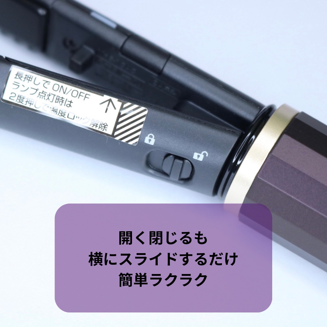 持ち運びたいヘアアイロン♪ パッとみた感じはヘアアイロンにみえないオシャレなスティック。 ブラウンブラックのようなパープルの入ったブラックとゴールドの組み合わせが高級感あり! メイクポーチや小さいバックにも入る手のひらサイズが嬉しい♪