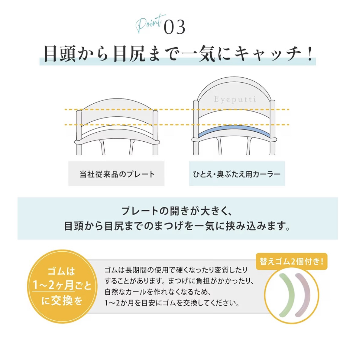 - まぶたに隠れたまつげも、根もとからカール。 ひとえ・奥ぶたえ用のアイラッシュカーラー。「眼球サイズ」+「まぶたの厚み」に着目した独自カーブと、高さのあるプレートを採用。まぶたを押し上げ隠れたまつげの生えぎわを引き出し、まつげを根もとからしっかりと立ち上げます。ひとえ・奥ぶたえに理想的なまつげを手軽に実現します。