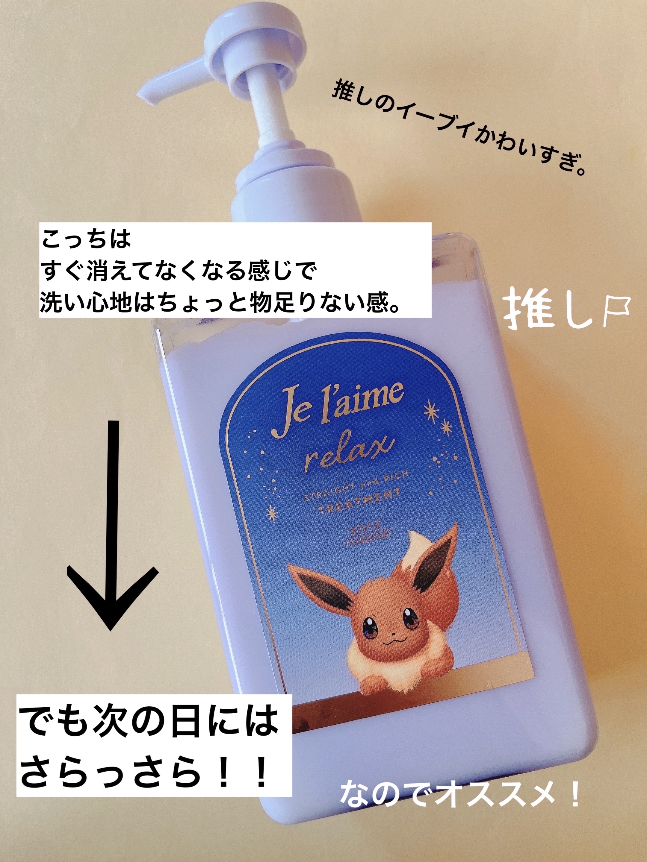 Jel'aimeリラックスミッドナイトリペアシャンプー/ヘアトリートメントストレート&リッチポケモンデザイン ポンプペアセット480mL+480mLめちゃめちゃかわいいポケモンのイラストがついたパケでテンション上がる⤴️もうひとつ、ポッチャマがついたつやつやタイプのもありましたが、(ストレート&グロス)私はイーブイ推しなので、こっちのしっとりタイプにしてみました!(ストレート&リッチ)使ってみたのでレビューします♪ピカチュウのイラストのシャンプーは、泡立ち良くて香りも良くて気に入りました!アロマティックジャスミンの香りらしいのですが、甘酸っぱさもあって、個人的には桜🌸っぽい香りですごく好きな香り!使い心地が良くて気に入りました◎しかし、イーブイのイラストのトリートメントですが、さらっとしているというか、髪に染み込みやすいのかつけてもつけてもつけてる感じがあまりしなくてつけすぎてしまう感じがしました。。。消えてなくなるというか。。。香りもピカチュウのシャンプーより甘ったるいのに薄い感じに感じてしまい、物足りなさは感じました。イーブイ推しだけどこの勝負はピカチュウの勝ちかもしれないです。。。しかし、次の日の髪の調子は良くて、さらっさらでした!!トリートメントが髪に吸収されたのだとおもいます!イーブイ、じつはいいトリートメントだった!ただ、つい使い過ぎてしまい減りが早いかなって思うので、ちょっと物足りないくらいでやめておこうかなって思いました〜!私の強烈なうねりは改善しないかな?とは思ったけど、手触りはさらさらになり、髪の調子は格段に良くなるのでオススメです!😊#値上げ前のマストバイ#ポケモンコラボ#ポケモン#可愛いパケ#パケ買い#しっとり