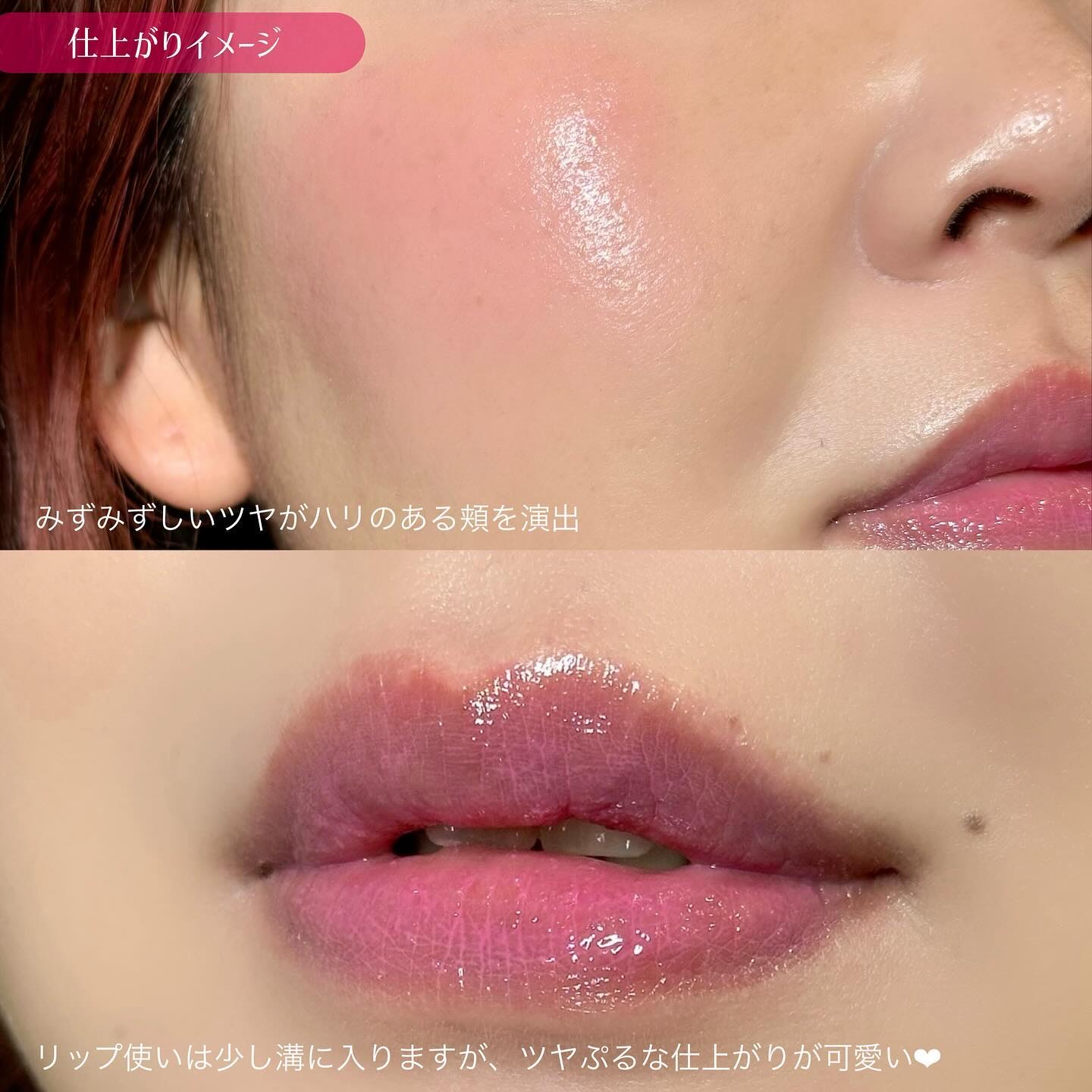 ツヤタイプの登場に加え、可愛いパッケージにテンションが爆上がり💕 クリアな容器が可愛くて集めたくなります💗 重ねても透明感が損なわれない所は素晴らしい✨ チークとして使うとぷりっとハリのある血色ほっぺが爆誕! 鮮やかなので顔をぱっと明るい印象に見せてくれます🩷 可愛い系のメイクに合いそうです。