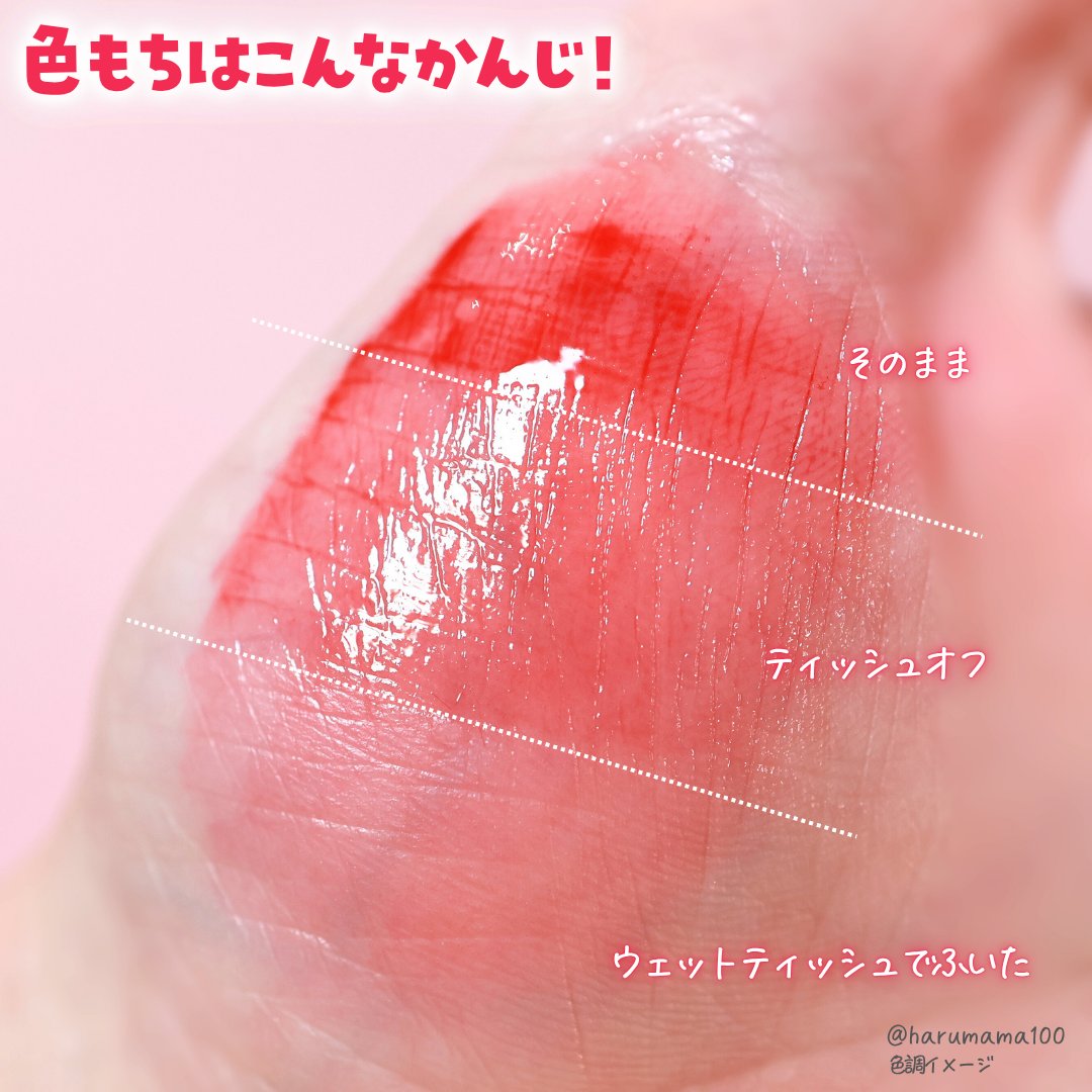 ティントなのにグロスっぽい。 果物のゼリーっぽいプルプルと透き通る綺麗さのリップ 縦じわが目立ちにくい 軽いのにツヤ感ボリュームある透け感 唇をコーテイングしてくれるから乾燥しにくい使い心地で良かったです。*個人差あります