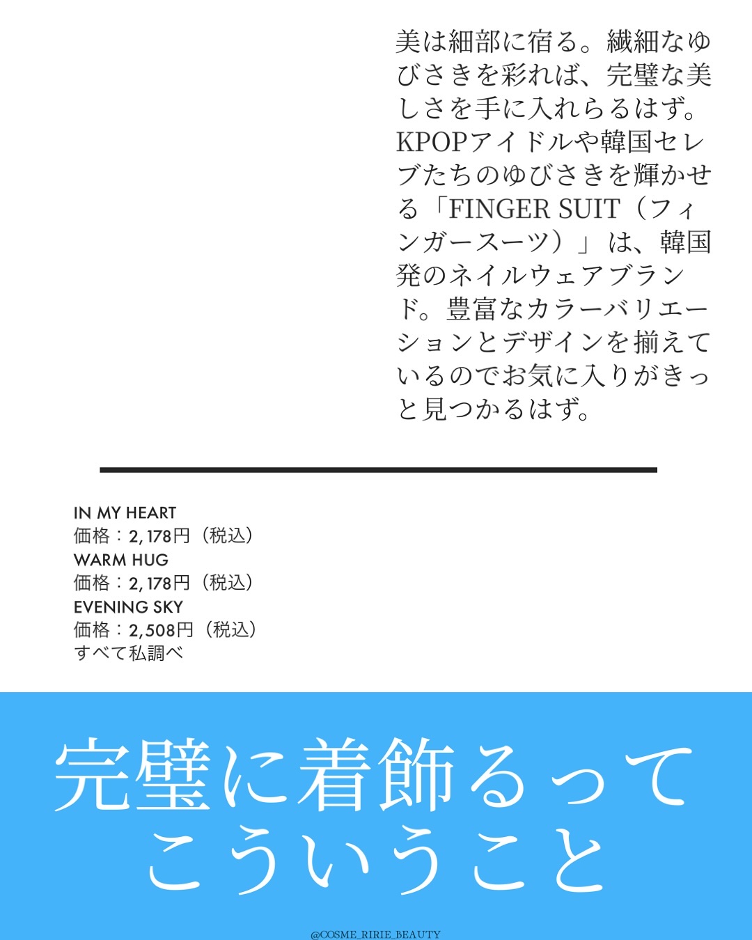 ✼••┈┈••✼••┈┈••✼••┈┈••✼••┈┈••✼ FINGERSUITWarmHug InMyHeart EveningSky✼••┈┈••✼••┈┈••✼••┈┈••✼••┈┈••✼K-popアイドル愛用のネイルブランド💅 FINGERSUIT/ネイルチップのシールタイプを3つ頂きました!InMyHeartデザインに一目惚れ❤︎1番使ってみたかったチップ!WarmHugゆめかわカラーでクマちゃんデザインがキュートEveningSky大人っぽくラグジュアリーなイメージ中には日本語説明書つきで、チップ40枚、油分をとるパッド2枚、ミニファイル1つ、ウッドスティック1本入りチップをつけようと思い立った時にすぐネイルできちゃう!普段ネイルができないから休日にはチップでネイルを楽しみたい❤︎着る服でネイル変えたい時にもすぐ変えられる!シールタイプだけでなく、グルーでもシールでもOKなリユーザブルタイプもポリッシュもあるのも魅力的✨今回はInMyHeartを使ってみました!長時間水に濡れるのには気を遣っていたのもあるのか、お風呂入ってもチップが取れる気配なし!寝てる間も大丈夫!シールが強力+プレップパッドプラスにフィックス効果があるみたい!5〜7日で外すことを推奨してるみたいなので、次のチップはそのくらいもつのか試してみたいと思います!!その後EveningSkyを試しました!3日しか付けられず、つけたあと結構爪の先に負担かけたりもしましたが、取れることはなかったです。#PR#フィンガースーツ#FINGERSUIT#LIPSプレゼント#WarmHug#InMyHeart#EveningSky