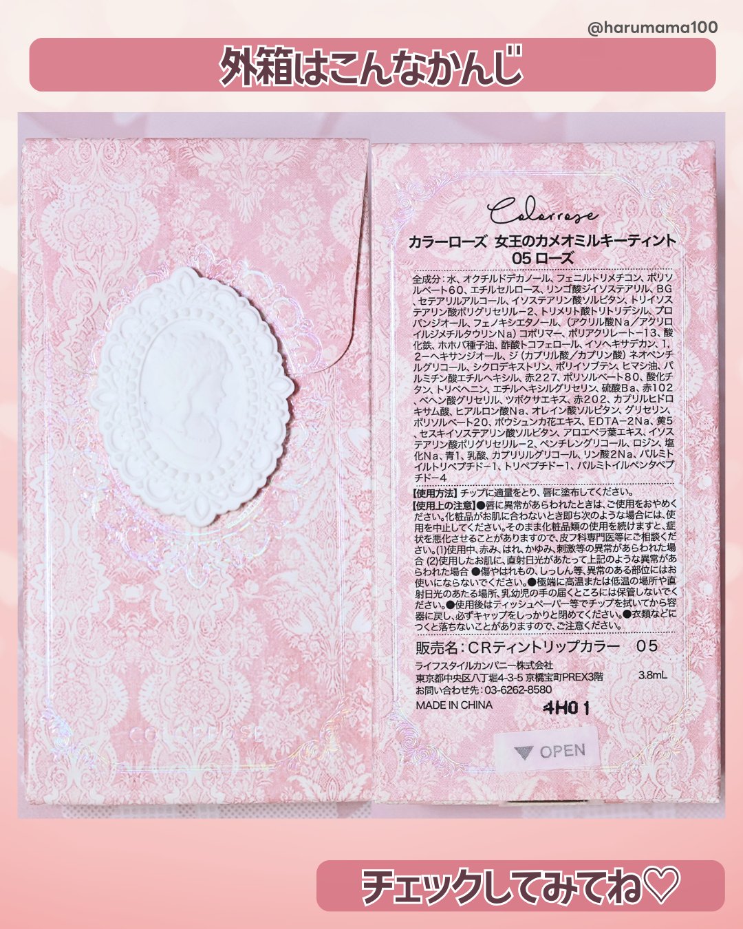 【薔薇みるくのビジュ映えティント🌹】───────────────COLORROSE女王のカメオミルキーティント05ローズ参考価格1,600円(税込)───────────────デザインの可愛さで定評のある「カラーローズ」のティント見つけた!このブランド、凝った雰囲気がありつつも使いやすくていいんだよねぇ〜。今回ご紹介するティントは薔薇色をほんのりミルキーにした透け色カラー。薄付きでムラになりがちなんだけど、むしろニュアンスと奥行きが出たよ♪オイルジェルみたいなツヤも相まって今どきのグラデ仕上げになった🙌あとあと、外箱も可愛いから捨てらんないよー🤭❣️───────────────#コスメ購入品#내돈내산#COLORROSE#カラーローズ#リップメイク#リップ#ティント#ミルキーコスメ#lip#tint#こっくりカラーコスメ#パケ買い#パケ買いコスメ#パケ買いリップ