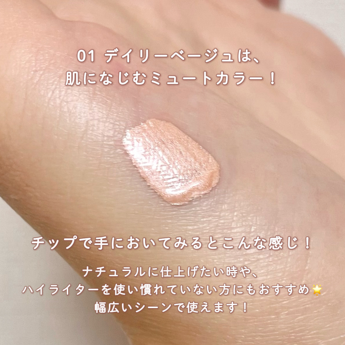 みずみずしいリキッドハイライト❤️ 乾燥シーズンにも嬉しいリキッドタイプ♥️ 01デイリーベージュ ナチュラル使いにおすすめ✨ リキッドだから乾燥しにくくサラッと伸びがいいテクスチャー😊✨