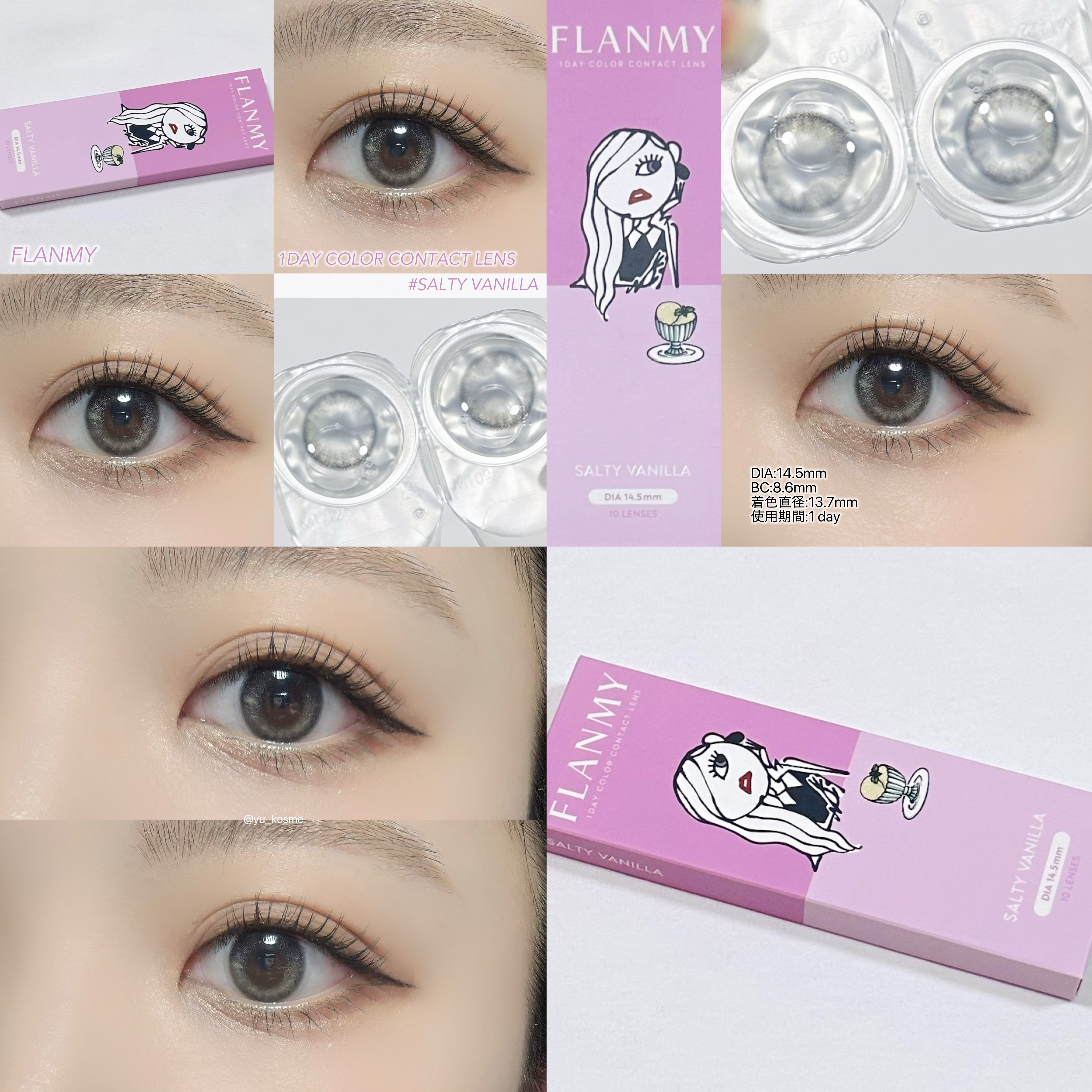 FLANMY 1day ソルティーバニラ(モアコン限定色) DIA14.5mm GDIA13.7mm 11/5新発売♡ バニラグレー×ハイライトの配色で、グレーカラコンなのにクールになりすぎない絶妙なカラーに♡ 着色直径13.7mmとやや大きめですが、立体感のあるデザインで宇宙人っぽくなることなく使いやすいです。