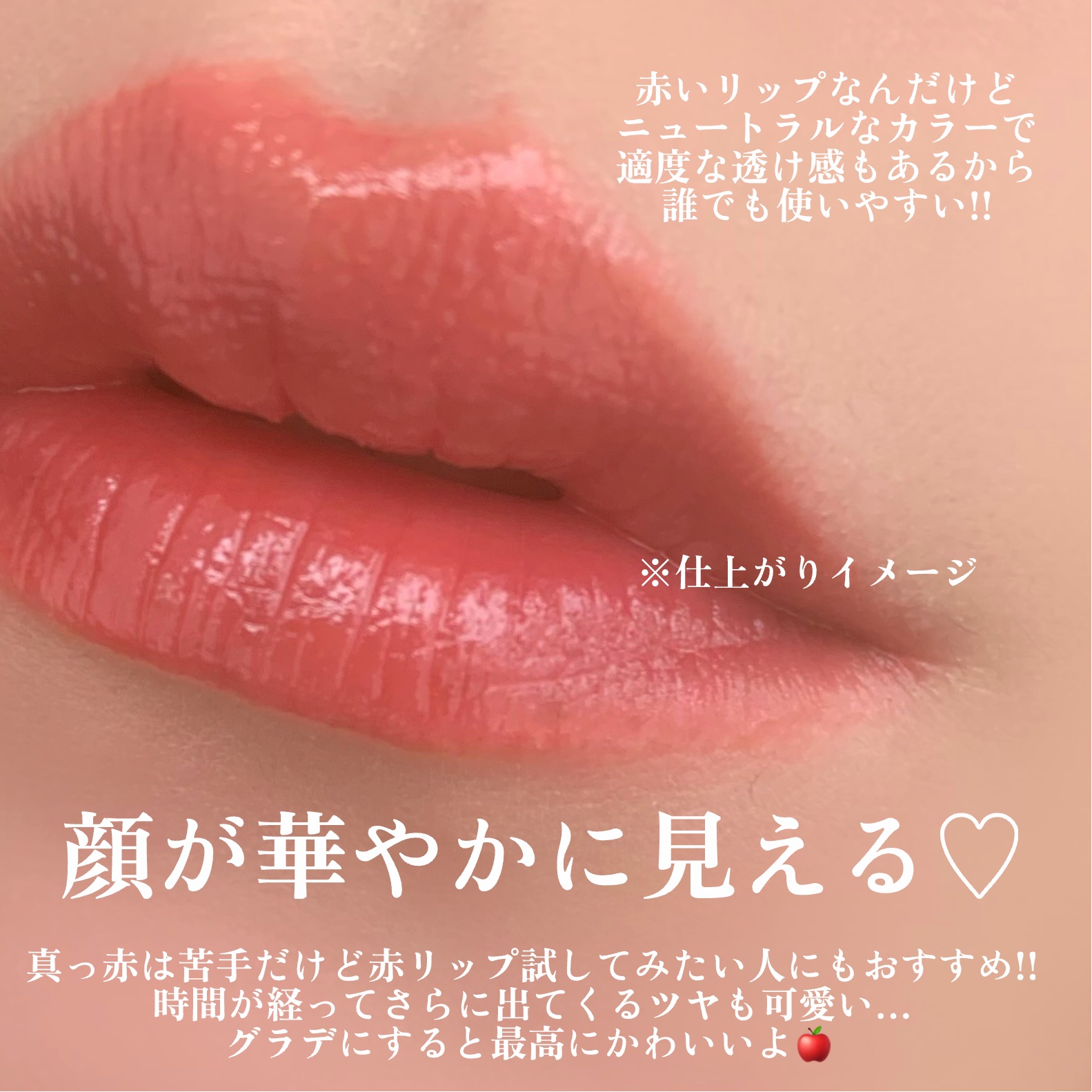 私の人生ティントの中でも、お気に入りの一色になりました💞 赤リップ、と見せかけて意外と濃すぎない発色が、イエベ春(2ndブルベ夏)の私には神すぎて! とにかく時間が経つほどツヤが出てくるような、うるぷる水分ティント! 唇も荒れにくいし、唇乾燥しがちな季節で落ちにくさ重視の時はこのシリーズしか使ってないくらい!