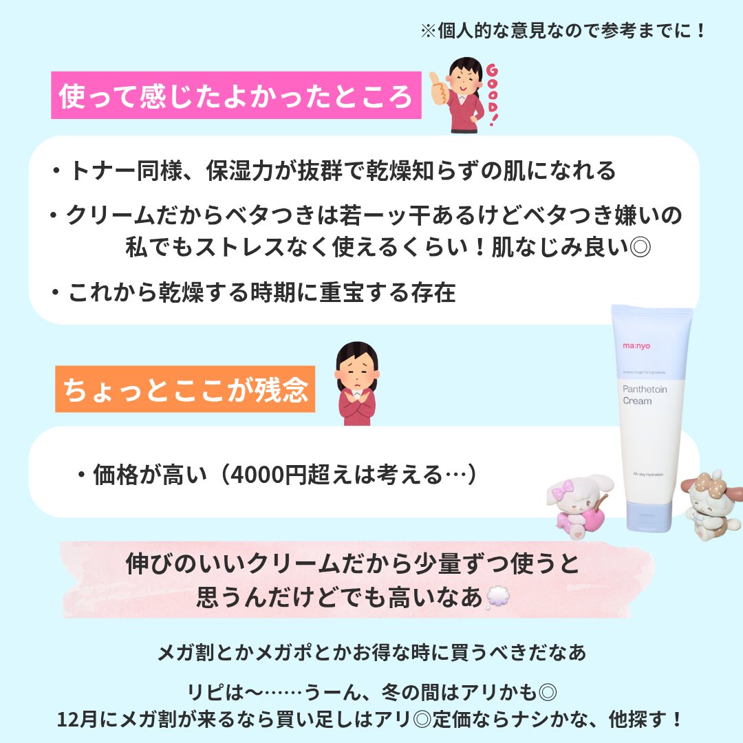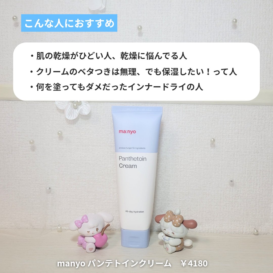 \保湿力MAXでベタつき0/今回は、私のお気に入りmanyoのパンテトインシリーズから『manyoパンテトインクリーム』を紹介します❤︎【manyoパンテトインクリーム】¥4180前の投稿で書いたように、パンテトインシリーズのトナーがお気に入りなんですけど今回のメガ割でクリームも購入したので正直にレビューします!!パンテトインクリームもトナー同様、こっくり濃厚系の長時間保湿クリーム。ベタつかないのに肌はしっとり高保湿で私みたいなベタつき嫌いの人におすすめ🫵🏻主に、保湿とゆらぎ肌を整えてくれる役割って感じかな🩷使用感は、確かにめっちゃ高保湿。これは冬の乾燥の時期に使いたい感じ!夏だと重たいかなあって気はするけどベタつきが少ないから人によっては夏でも使えるかも◎あと、個人的に重要なベタつき度!全くベタつき0!って感じではないかも💭💭確かに肌なじみ良くて保湿されてる感じがあってすごくいいんだけど、ベタつき0!!!は言い過ぎ?🥹ベタつき若ーッ干感じるけどベタベタ過ぎて無理ってほどじゃないし不快なベタつきじゃない!!ほんとに若干ベタつきはあるかな(クリームだしね)伸びがいいから薄ーく伸ばして使えば全然ベタつきが気にならない程度やと思います◎もう少し価格が安かったらリピありだけど12月のメガ割まで待つかなあ💭トナーはリピ確なくらい好きだけどクリームは冬の乾燥が酷い時期だけ使いたいかも️⭕️これからの時期は絶対大活躍間違いなし🫵🏻私の使用しての感想だから誰かの参考になれば嬉しいです🌼#manyo#魔女工房#パンテトイン#パンテトインクリーム#Qoo10#Qoo10メガ割#メガ割購入品#スキンケア#乾燥対策#クリーム#アラサー#アラサースキンケア#正直レビュー