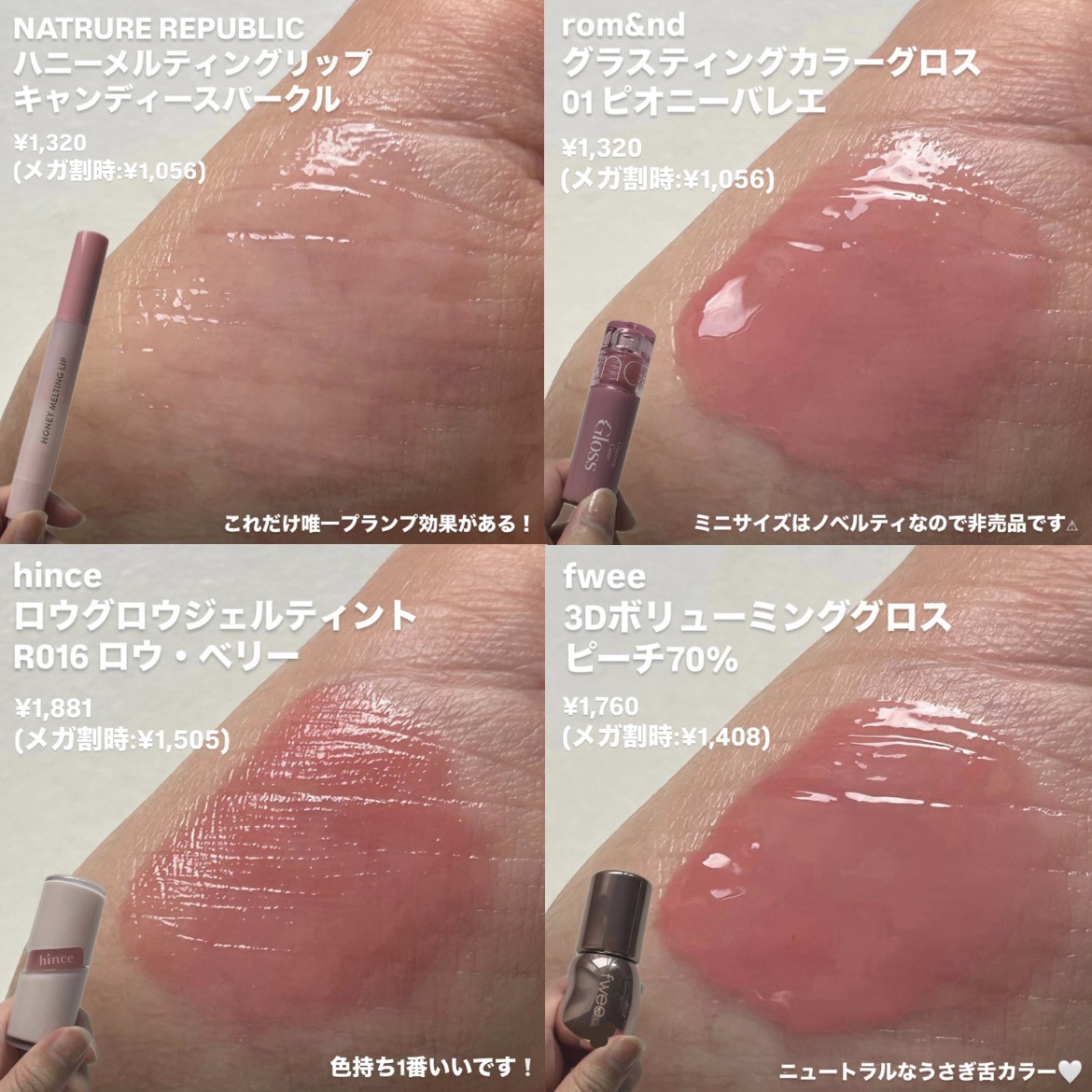 【Qoo10メガ割おすすめ!うさぎ舌リップ🐰💗】____________NATRUREREPUBLICハニーメルティングリップキャンディースパークル¥1,320(メガ割時:¥1,056)ナチュラル重視ならこれ!これだけ唯一プランプ効果がある!_______rom&ndグラスティングカラーグロス01ピオニーバレエ¥1,320(メガ割時:¥1,056)どブルベならこれ!ミニサイズはノベルティなので非売品です⚠︎︎_______hinceロウグロウジェルティントR016ロウ・ベリー¥1,881(メガ割時:¥1,505)色持ち重視ならこれ!ティントだけどツヤの持続性高め!_______fwee3Dボリューミンググロスピーチ70%¥1,760(メガ割時:¥1,408)ニュートラルなうさぎ舌カラー🤍うさぎ舌に挑戦したいイエベさんまずはこれ試してみて欲しい!____________Qoo10メガ割におすすめです💗#ネイチャーリパブリック#ロムアンド#ヒンス#フィー#うさぎ舌リップ#ピンクリップ#ツヤリップ#飲み会リップ#韓国コスメ#韓国リップ#プランパー#Qoo10#メガ割