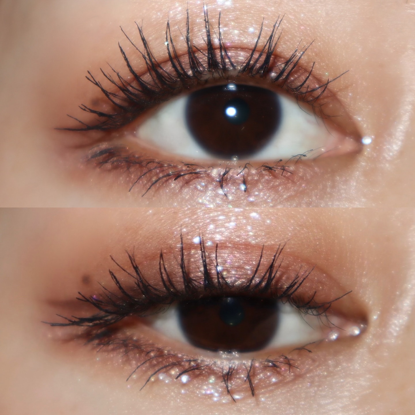 ブラウン系のナチュラル仕上がり、限定だけど使いやすい! 左上→ポイント✨超キラキラ華やか白青ラメ(全然写せてない😂) 左下→ピンクに重ねてアイホール全体+下まぶた全体塗れば涙袋爆誕