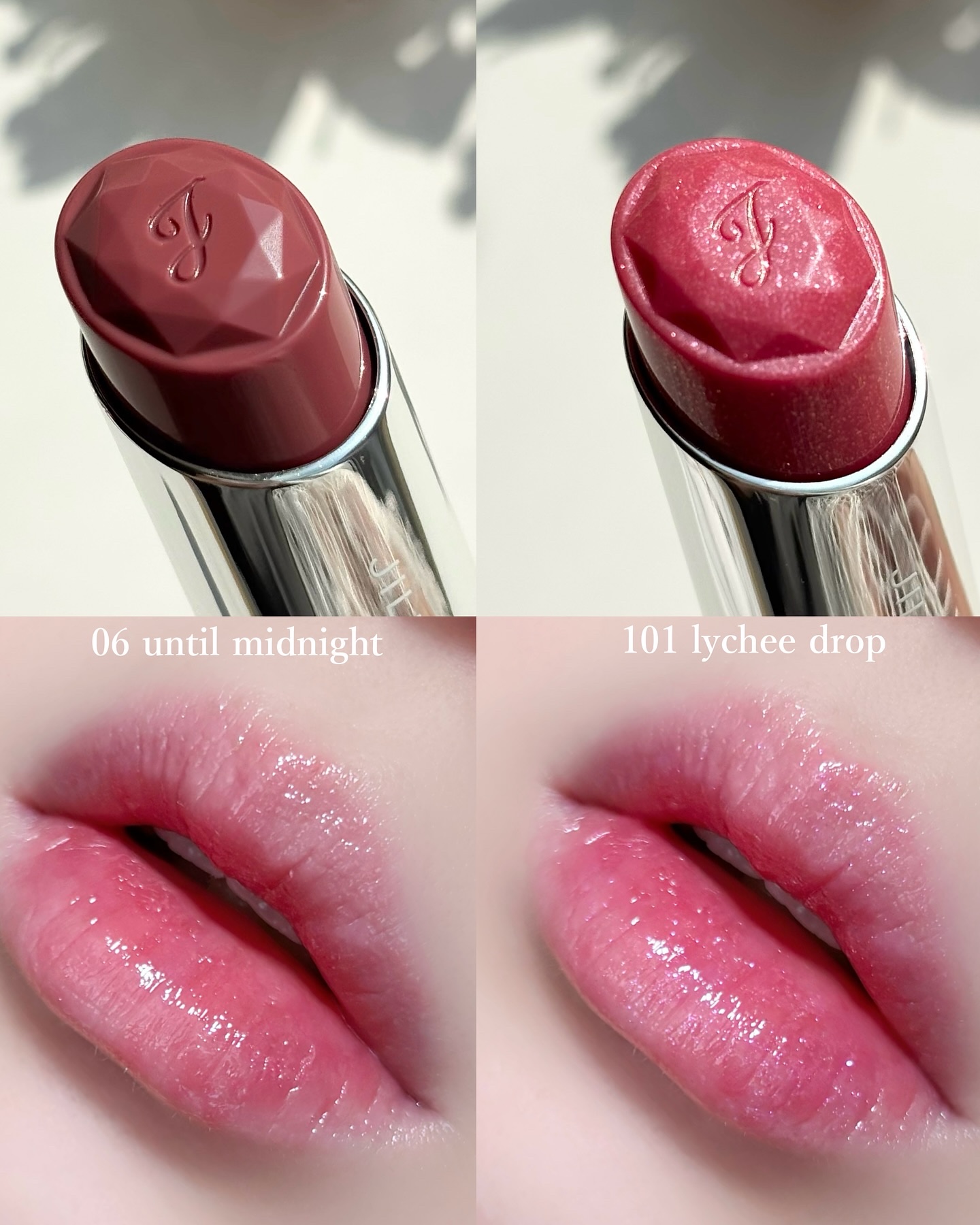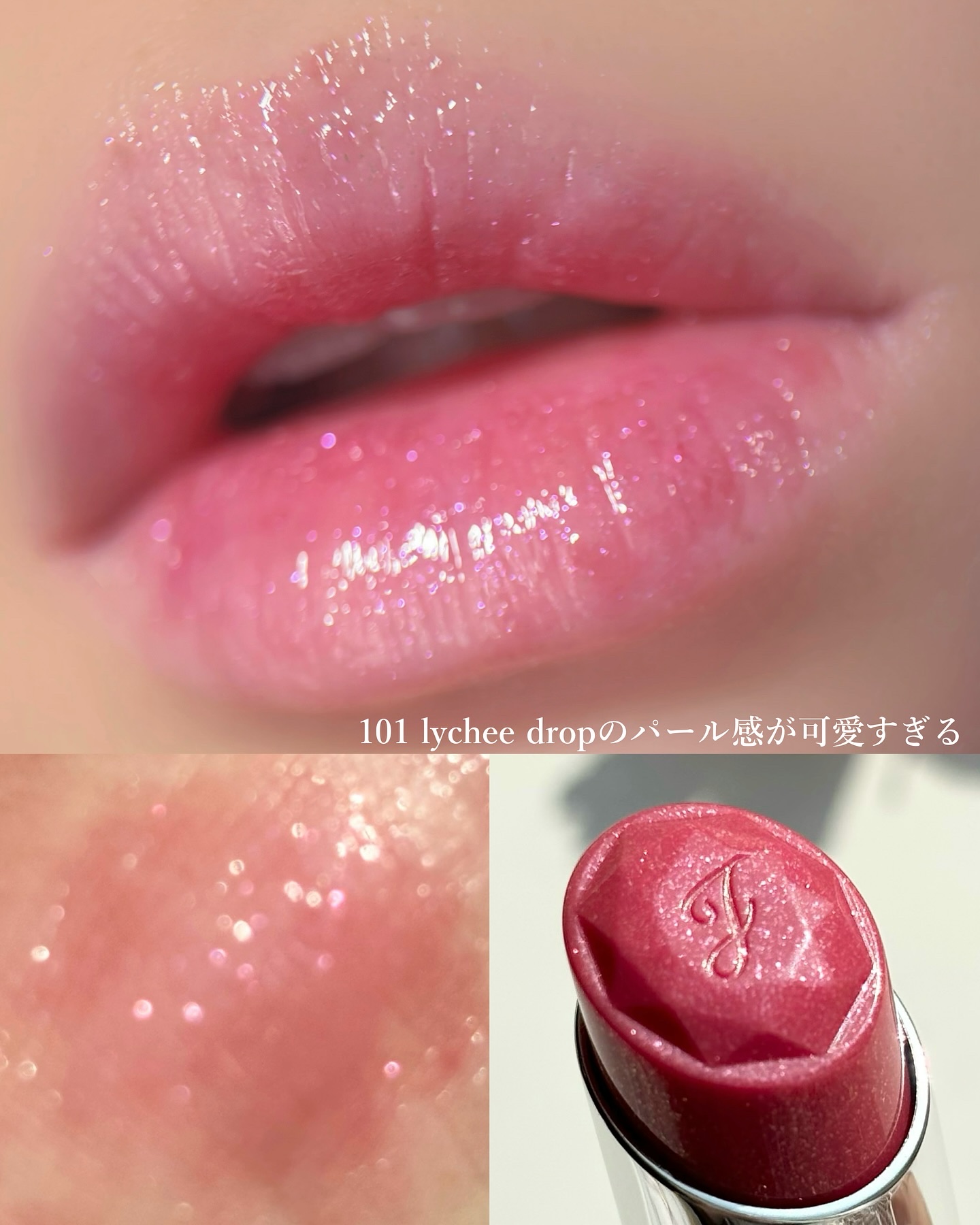 塗り直しのしやすさが気に入って平日使い用として06と限定色を購入♡ シアーだけどなめらかでぷりっした質感が歯紅を気にせず手に入るんだ。 06 until midnight 夜更けの静けさをイメージしたパープル(ノンパール) ブルベ冬わたしがすっぴんで浮かない自分の唇色ですよ、と言えるカラー。 101 lychee drop ライチのピュアな香りをイメージしたローズピンク(シルバー~ピンクパール) 狙いだった限定色!