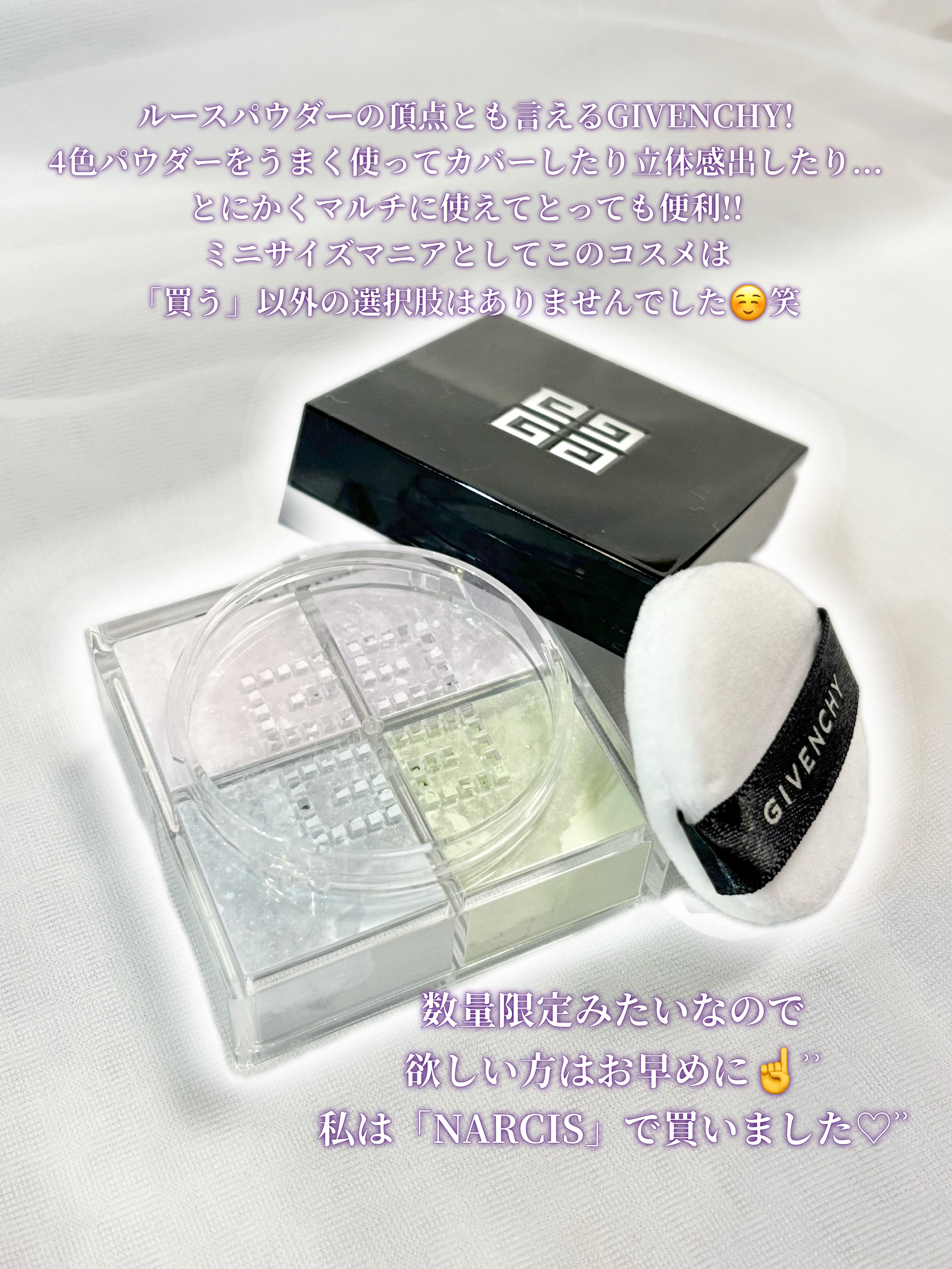 🔥𝐆𝐈𝐕𝐄𝐍𝐂𝐇𝐘神ルース໒꒱⋆゚ミニサイズ発売🔥 𓊆ྀི𝐆𝐈𝐕𝐄𝐍𝐂𝐇𝐘𓊇ྀི プリズム・リーブル・トラベル(全5色)↳No.01パステル・シフォン ¥4,180 ⑅┈┈┈┈┈┈┈商品説明┈┈┈┈┈┈┈⑅ “人の肌色は単色では表現できない”というブランドの創始者ユベール・ド・ジバンシィの考え方によって生まれた世界初の4色構成フェイスパウダー。第7世代の「プリズム・リーブル」は、光とろける粉ツヤが4色の光で肌悩みを洗い上げ、透明感が清らかさにまで極まった清光美肌へ。超微粒子のマイクロナイズドパウダーがフィットしてよりリアルな素肌美を演出。 独自のプリズマティックライト™︎テクノロジーが肌の奥までとろけこんだような、立体感のあるツヤを実現。 ※上記公式サイト引用 ⑅┈┈┈┈┈┈┈┈個人的使用感┈┈┈┈┈┈┈⑅ このパウダーのミニをずっと待ってました🥹👏₊⊹(と言っても以前も数量限定で出てたらしい🤔💭͗͗︎︎) 大きいし高いしで、ずーっと我慢してたけどミニが出るということはもう私にとっては「買う」と言うことでした🤤💸͗͗︎︎笑 BAさんにパウダーの使い方の裏技も教えてもらってその場でお直ししたらほんと一瞬で小鼻の赤み消えてびっくり👀̖́-さすがすぎる...!!♡ʾʾ 私はNARCIS(ナルシス)で買いました✍︎꙳⋆!(単品買いはNARCISしかできないらしい🤭̖́-)┈┈┈┈┈┈┈┈❁❁❁┈┈┈┈┈┈┈┈⸜❤︎⸝𝚃𝚑𝚊𝚗𝚔𝚢𝚘𝚞𝚏𝚘𝚛𝚛𝚎𝚊𝚍𝚒𝚗𝚐⸜❤︎⸝ #GIVENCHY#ジバンシィ#ジバンシイ#ジバンシー#givenchy#プリズムリーブルトラベル#ルースパウダー#パウダー#メイク直し#デパコス#NARCIS#narcis#ナルシス