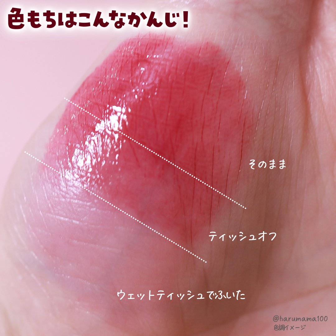 結構バズっていてオリヤンランキングでも上位のジューシーラスティングティントですが、色は公式より薄めで持ちがいいとも思いませんでした。 重ね塗りしたらめっちゃ可愛いと私的におすすめなのはETUDEのフィキシングティントの15番の上に重ねるとめっちゃ紫っぽくなって可愛いです! 塗った直後はペタっとしていますが、すぐに乾いて塗り心地は軽めです。