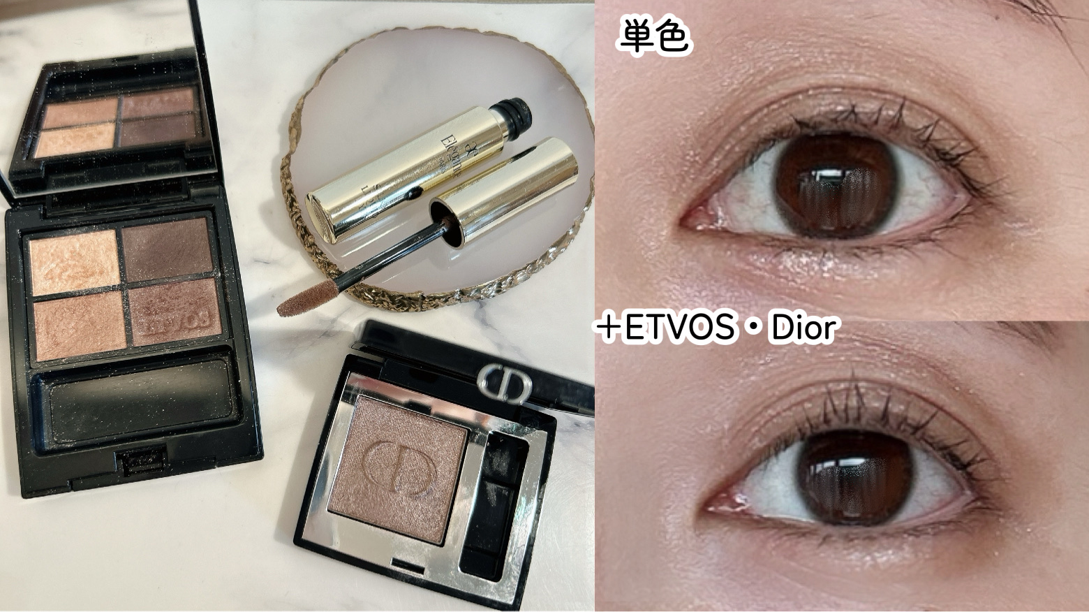 エレガンスシルキーリクイッドアイズ03 “シックで落ち着きのあるクリーミーブラウン”このリキッドアイシャドウかなり使いやすい気がする。伸びが良くて密着感高く濃淡つけやすい。個人的にはTHREEよりつけやすい。(THREEは色味がより洒落感あるのが多い03はピンクっぽいパールも入っててコーラル味感じるでもきちんと締まる!そして艶と煌めきがとても綺麗。単色でも良い感じ◎最近ブラウンシャドウをあれやこれや重ねるのにもハマっていて…奥行きが増すし濁ることはないから楽しい今回はETVOSスローベージュとDiorベージュミッツァを合わせてみました単色使いよりも立体感が出るこれを購入した時目元にもメイクの上から試したのですがしっとりとしてとても綺麗に整えてくれましたお直しにもめちゃ優秀だと思うサイズ感は結構小ぶり。キャンメイクのマスカラくらいかな5.5g。THREEは6gなので比べると少し少なめ(少なめというほどでもないけど持ち歩きにもちょうど良いです🙆🏻♀️#新作コスメ#第一印象アップ術#リキッドアイシャドウ#春コスメ
