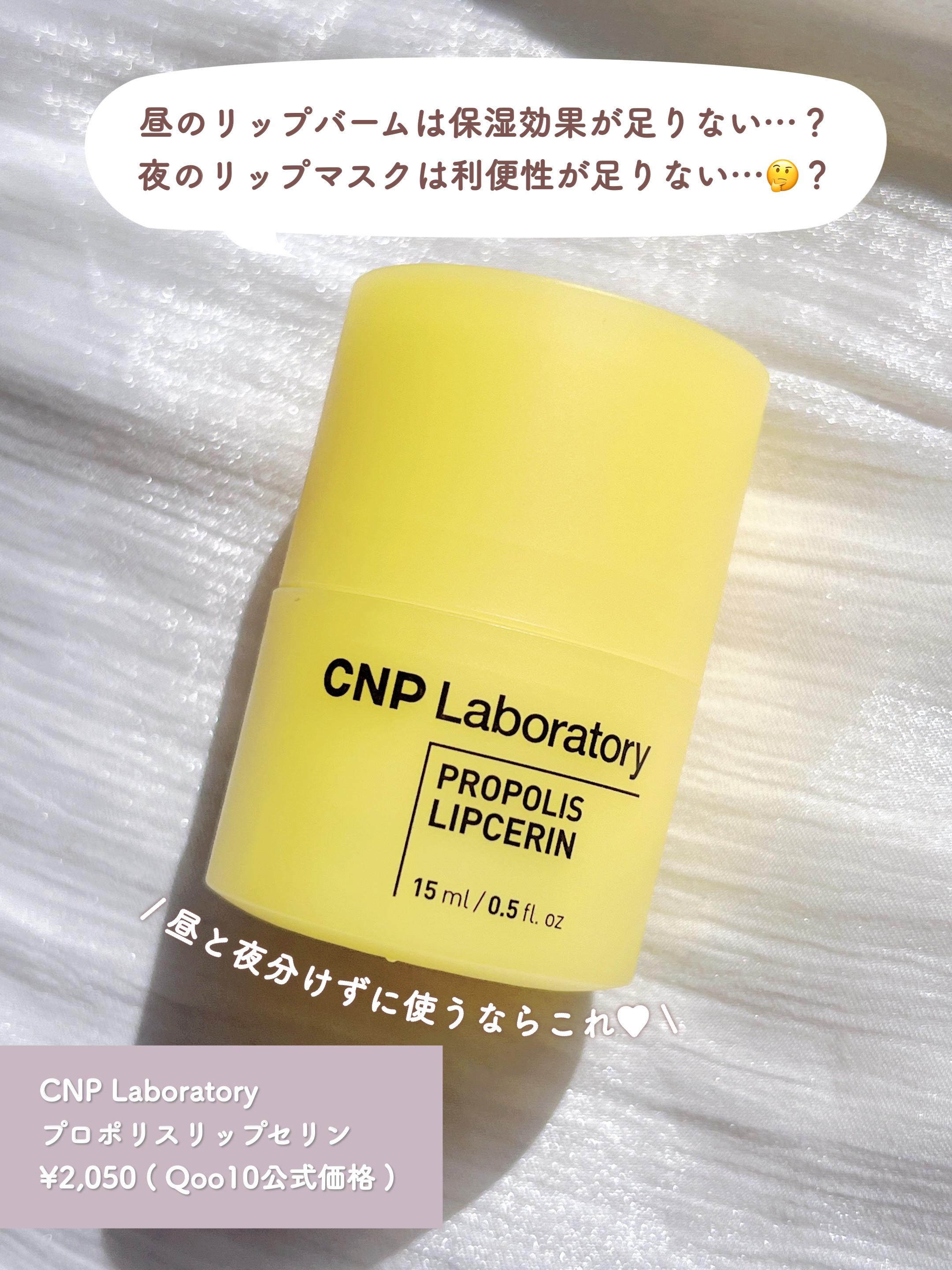 ねっとり固めのテクスチャーで唇の温度で溶けカサカサした唇でもピタッと密着し皮剥けなどをおさえてくれる高保湿で長時間ふっくら弾力のある唇に CNPのこだわりの保湿成分であるプロポリスエキスとハチミツエキスを配合 日中のリップケアにはもちろん寝る前のスペシャルケアとして唇にたっぷりのせてリップマスク風にも