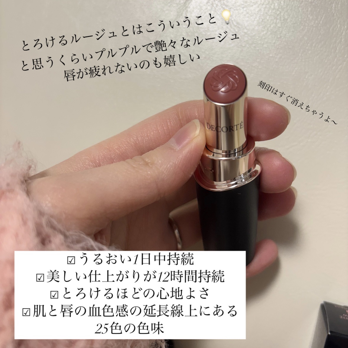 購入してから使う頻度が高い評判のDECORTÉリップ。 なめらかに塗れてうるうる。ティッシュオフしても潤いが残ってるのわかる✨️ 唇に塗ると夕方見たときに血色感が残ってるという不思議。 ティントじゃないのに落ちにくいと言われるのはこーゆうことかなぁと思った。 もう1本欲しくなった⋯だけど色が多すぎて選びきらんしめんどくさい🤣ʷʷ