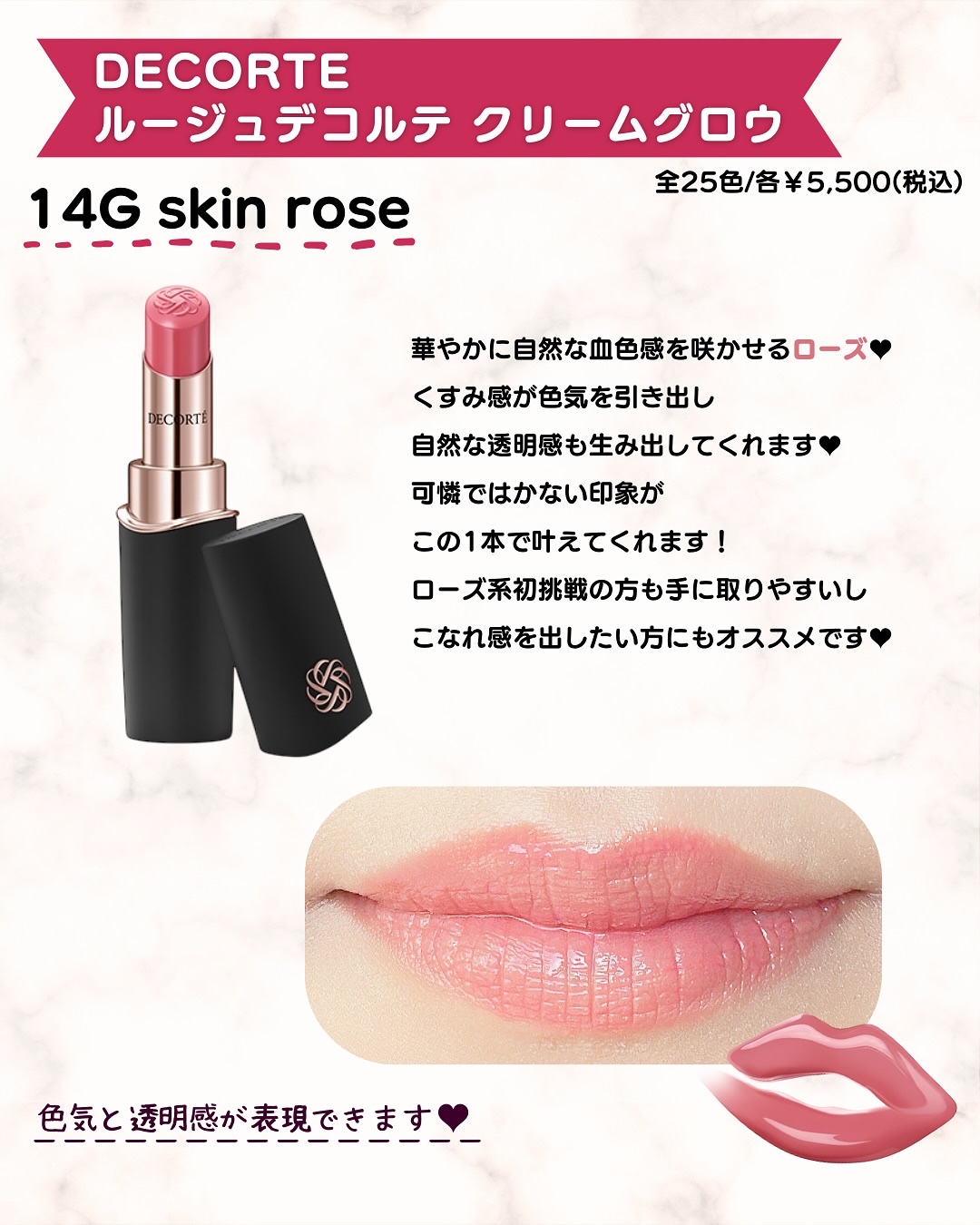 この春大注目!コスメデコルテから新作ルージュが登場! 1/8先行発売、1/16〜全国発売。 するする塗布できて、艶とハリ感を与えてくれるんです🥹(メイクアップ効果による) 全25色各¥5,500(税込)