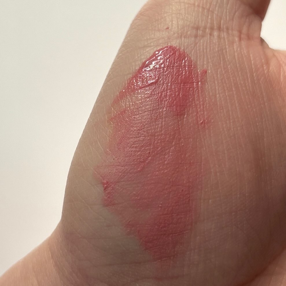 ビニールみたいな光沢感が特徴で、手に出した時より唇に乗った時の色味は淡め。唇の血色感が透ける感じ。 こっちがよりお気に入りです。ただし、クセありリップです。 発色は淡いです。手に出した色と全然違うのは見て分かると思います。