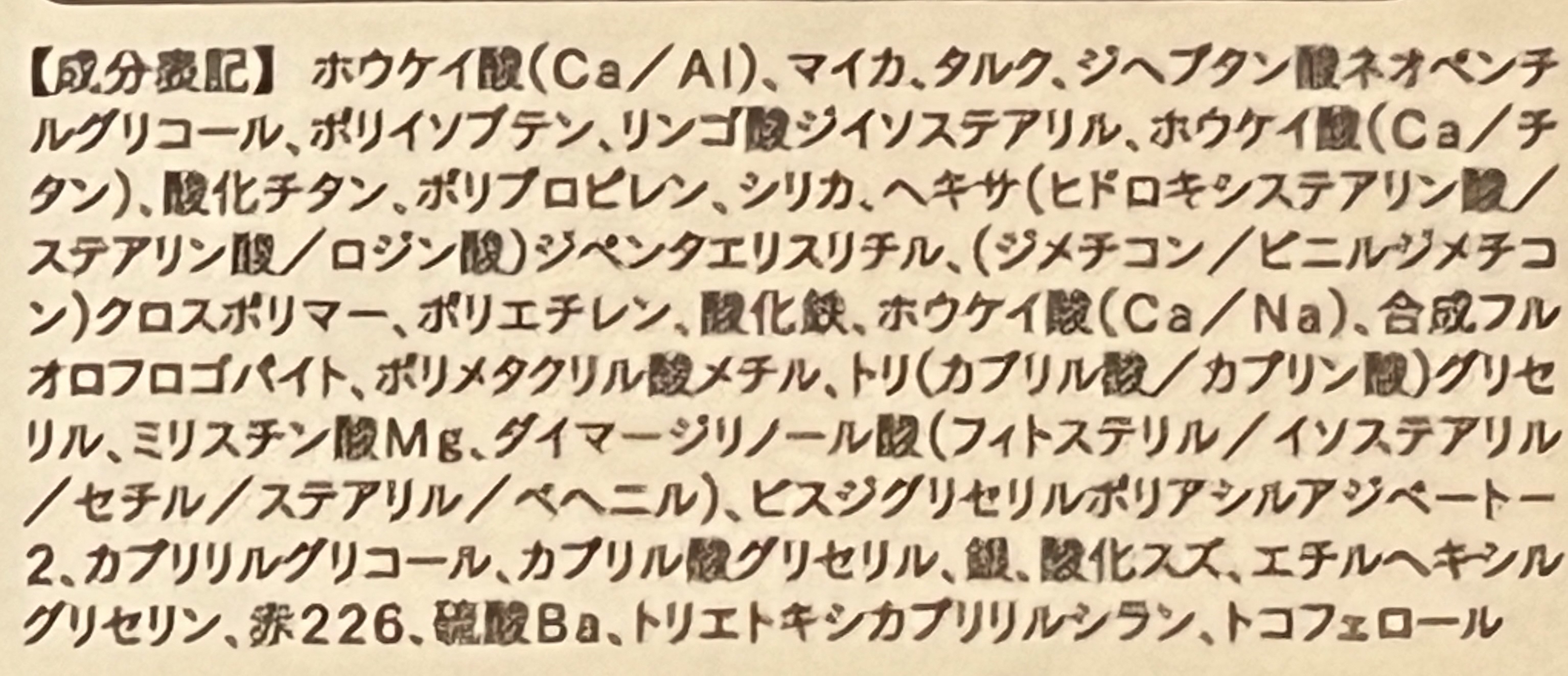 - ホウケイ酸(Ca/Al)、マイカ、タルク、ジヘプタン酸ネオペンチルグリコール、ポリイソブテン、リンゴ酸ジイソ ステアリル、ホウケイ酸(Ca/チタン)、酸化チタン、ポリプロピレン、シリカ、ヘキサ(ヒドロキシステアリン酸/ ステアリン酸/ロジン酸)ジペンタエリスリチル、(ジメチコン/ビニルジメチコン)クロスポリマー、ポリエチレン、酸化鉄、ホウケイ酸(Ca/Na)、合成フルオロフロゴパイト、ポリメタクリル酸メチル、トリ(カプリル酸/カプリ ン酸)グリセリル、ミリスチン酸Mg、ダイマージリノール酸(フィトステリル/イソステアリル/セチル/ステアリ ル/ベヘニル)、ビスジグリセリルポリアシルアジペート-2、カプリリルグリコール、カプリル酸グリセリル、銀、酸化スズ、エチルヘキシルグリセリン、赤226、硫酸Ba、トリエトキシカプリリルシラン、トコフェロール