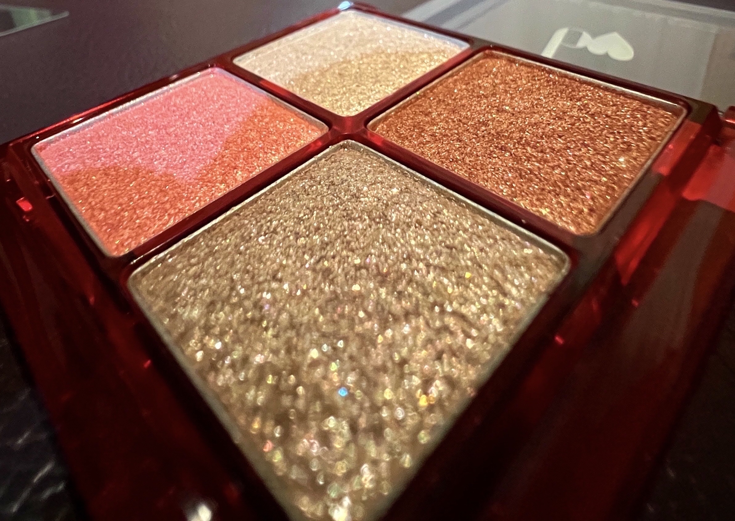 楽しみにしていた限定パレット! ケースも赤でクリスマスっぽくて可愛い🎄 全色ラメの豪華なパレット💎 ラメの色も大きさも光の強さも全部違います! 右上が割と発色するので一応これ1個でも使えます! 左下のピンクを涙袋に塗ったらとてもかわいかったです💖