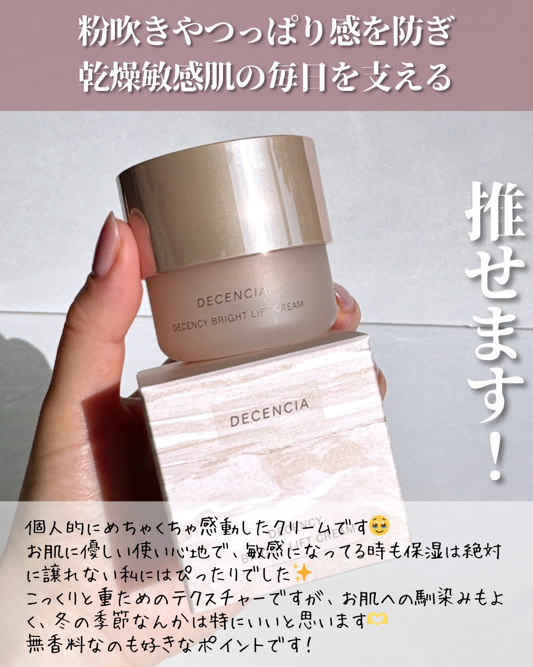 ⋆⸜⸜DECENCIAさまより頂きました¨̮♡ありがとうございます*𓆸⋆*⸝⸝⋆𖢇┈┈┈┈┈┈┈┈┈┈┈┈┈┈┈┈┈┈𖧡𓅿𓈒𓏸DECENCIAディセンシアディセンシーブライトリフトクリーム<医薬部外品>透明感美白*1ケア・たるみ印象ケア*2・高保湿肌荒れケアの3つすべてを1品で叶えます。7つのブライトリフト・テクノロジー*3が集結し、肌でじゅわっととろけて、パッと輝きをもたらし、ピンとストレッチフィット。溢れだす深く上質なうるおいで包み込み、明るく引き締まった肌へ。*1メラニンの蓄積を抑え、シミ・そばかすを防ぐこと*2ハリを保つことによる*3ポーラ・オルビスグループ独自有効成分D-パンテノールW(デクスパンテノールW)配合・ディセンシア独自成分セラミドナノスフィア(保湿成分)配合・たるみ印象ケアをサポートするゲットウ葉エキス(保湿成分)配合・ハリを感じさせるリフティングシールド・立体角層(うるおいが満ちてふっくらとした角層のこと)へ導くバスケットウィーブ®処方・角層をサポートするワイルドタイムエキス(タイムエキスー1:保湿成分)配合・透明感をサポートするアーティチョークエキス(保湿成分)配合𖢇┈┈┈┈┈┈┈┈┈┈┈┈┈┈┈┈┈┈𖧡敏感肌の知見とサイエンスを結集しさらなる進化を遂げた、“ディセンシア最高峰”クリーム…✴︎▪️溢れだす、深く上質なうるおいで包み込み、明るく引き締まった肌へ▪️美白・肌荒れ有効成分「D-パンテノールW*」配合*デクスパンテノールW▪️合成香料不使用/無着色/アルコール不使用/アレルギーテスト済み(全ての方にアレルギーが起こらないというわけではありません)/敏感肌の方の協力による連用テスト済み(全ての方の肌に合うというわけではありません)肌をうるおいで満たし、透明感あふれるハリ肌へと導く…医薬部外品の、敏感肌用美白*クリーム🤍(*メラニンの蓄積を抑え、シミ・そばかすを防ぐこと)バリア機能をサポートして、全方位ブライトリフトケアしてくれる…🥹嬉しい成分がたっぷり配合された、なんとも贅沢なクリームです!◎こんな方におすすめ◎・以前より肌が乾燥しやすく、カサつきがち。・どんよりくすんで、肌に透明感がない。・頬を触ると、硬く、ゴワつきがある。…まさに私です。季節の変わり目に急に肌の乾燥が気になり、肌のバリア機能が低下している…?そんなタイミングで、DECENCIAさんのとある企画で頂いたこちらのクリーム。結論からいうと、とても好みです、大好きです。コクのある濃密なテクスチャーのクリームでありながらも、伸びが良くて、スーッとなじんでいく感じが🙆肌になじんだ後は、クリームがうるおいラッピングを叶えているかのような保湿力◎個人的に、秋〜春メインに使いたい使用感!肌をふっくらなめらかに、そして明るく見せてくれるのが嬉しいです🤍ちなみに朝晩のスキンケアに使えますが、朝に使用してもべたついたり重い使用感ではないので個人的にとても使いやすいと感じています。メイクのノリが良くなるのも嬉しいです☺️私の中では美白ケア系やたるみケア系のスキンケアアイテムは肌がゆらぎやすい時にはあまり使えない印象なのですが、こちらのディセンシーブライトリフトクリームは高保湿肌荒れケアをしながらも、同時に透明感とハリ感アップを叶えてくれるのがとても嬉しいです🫶🏻肌がゆらぎやすい時も、調子が良い時もずっと使い続けたいクリームに出会えました🤍#DECENCIA#ディセンシア#ディセンシーブライトリフトクリーム#敏感肌#エイジングケア#保湿クリーム#敏感肌スキンケア#美白ケア#提供#わたしに贈る癒し美容