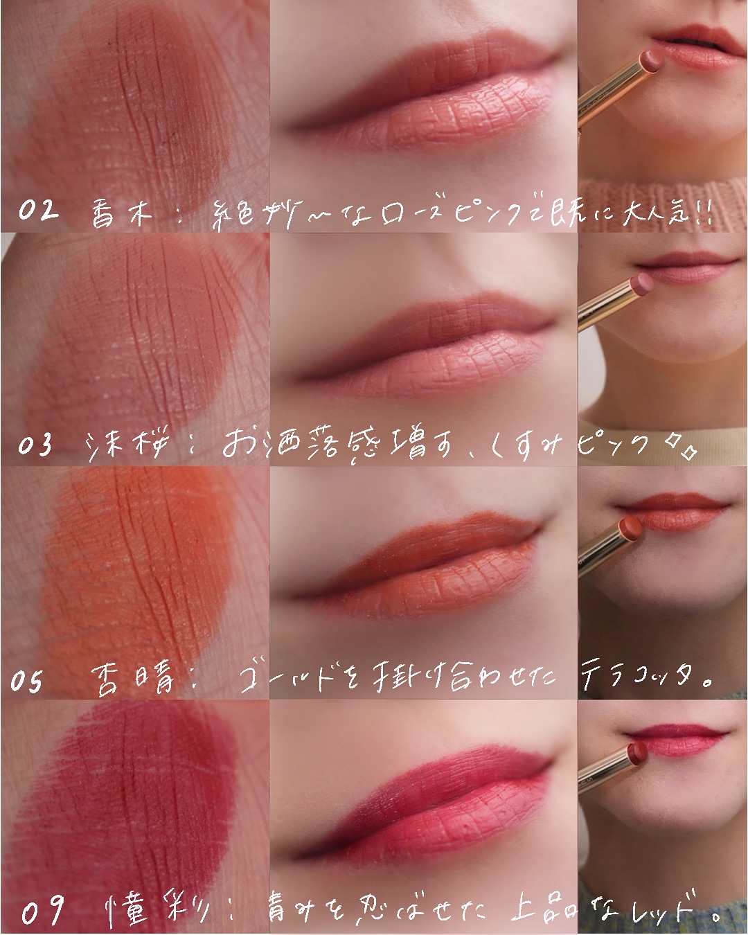 SUQQU ベルベット フィット リップスティック 01 薔薇和 -BARANAGOMI 02 香木 -KOUBOKU 03 沫桜 -AWASAKURA 04 夕桃 -YUUMOMO 05 杏晴 -ANZUBARE 06 憐華 -RENGE 07 余感 -YOKAN 08 静淑 -SEISHUKU 09 憧彩 -SHOUSAI 10 焦季 -KOGAREDOKI #パーソナルカラー #リップ #デパコス #デパコスリップ #乾燥シーズンマストバイ