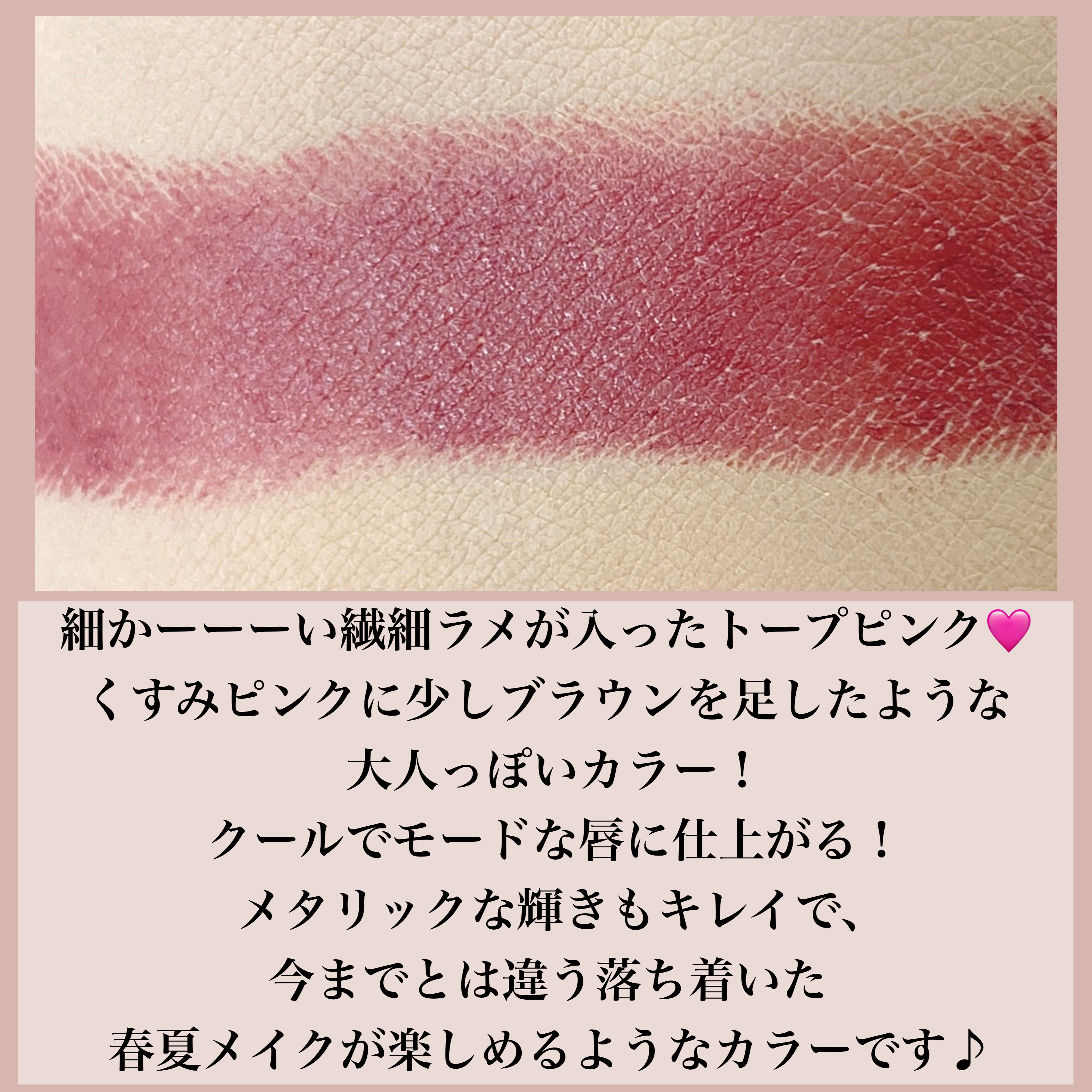 塗りやすさと美しさを両立したスリムなデザイン マットリップだけど乾燥しづらくスルスル塗れる!! メタリックなラメ入りトープピンク 馴染みがよくて元の唇の色と似てる、、ややくすみあり