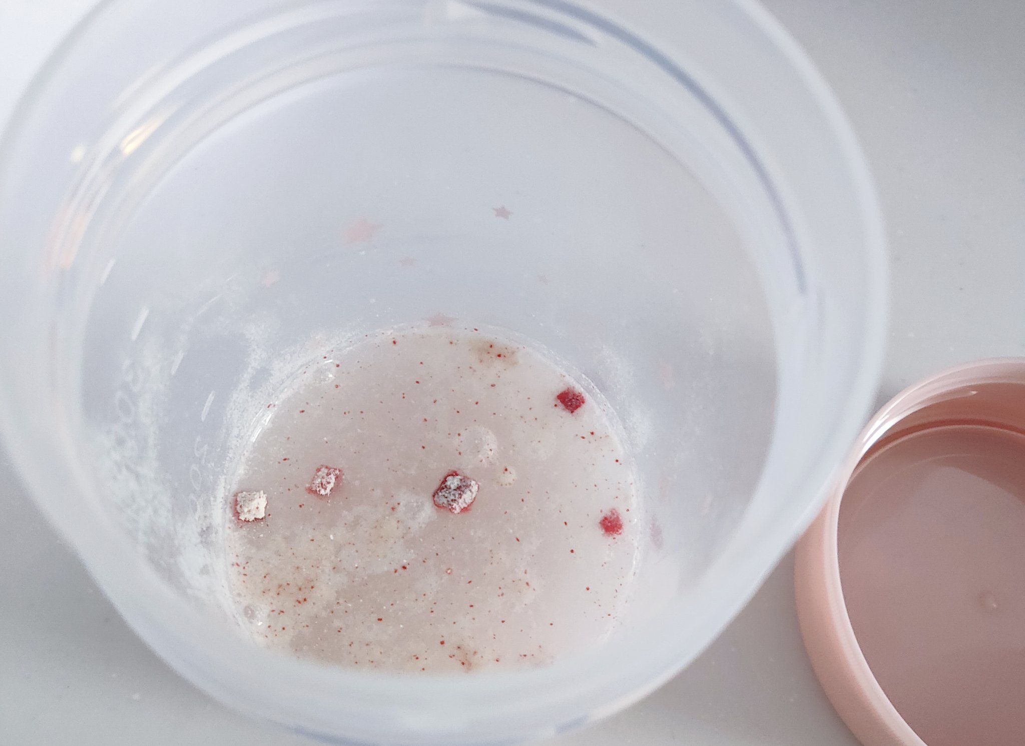 イチゴ味にはサクサクのフリーズドライ苺が入っています。イチゴがちょうどよく入るように、少し混ぜてからスプーンですくうといいようです。水で溶かすとさっぱり目、牛乳だといちごミルクのような味わいになりました。私は寝る前に飲むようにしているので、水でさっぱりが飲みやすかったです。甘酸っぱい風味ですが甘すぎなくてサラッとした飲み口なので、初めてプロテインを飲む場合もオススメだと思います。オヤスミタンパクたっぷりサイズイチゴ味#提供#ゆらぎ肌のお守りアイテム