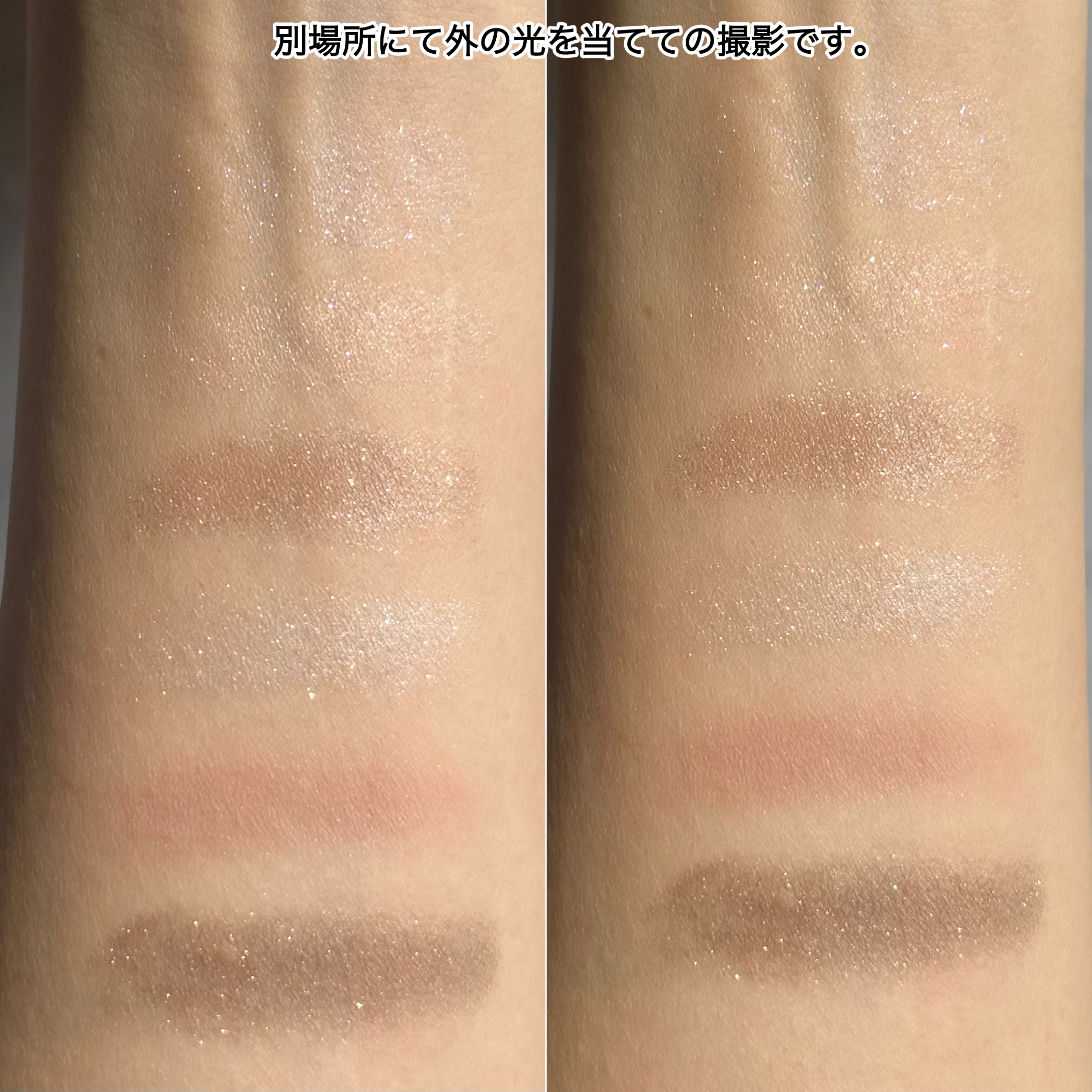 リニューアルの粉質と言う事で粉質めちゃくちゃ良かったです! 全体的に淡さはあるもののブラウンは結構発色あるし 重ねると綺麗に色味がでてくれます! あと、ラメが各々とても綺麗でした🥹