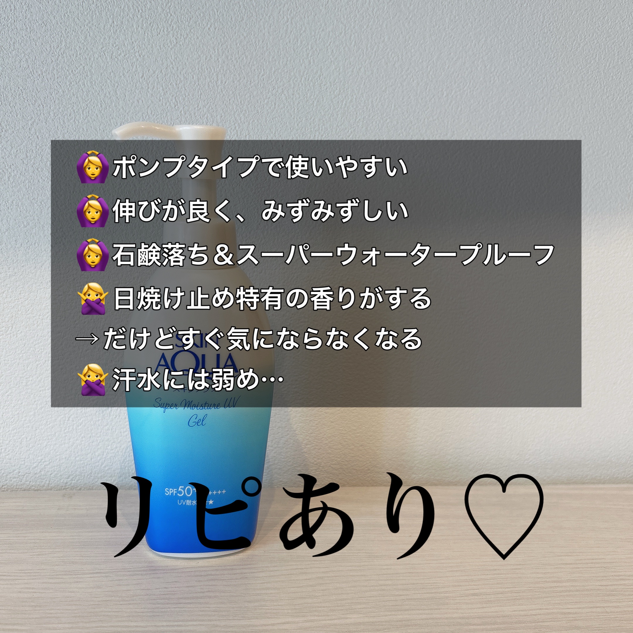 スキンアクアスーパーモイスチャージェル¥1375/140g(ポンプタイプ)夏には不可欠な日焼け止め🧴正直日焼け止めって種類たくさんあるし、どれ選んだらいいのか分からない🥹そんな時に口コミで絶賛されてたこちらをLIPSで購入🫶【よかった点】🙆♀️ポンプタイプで使いやすい🙆♀️伸びが良く、みずみずしい🙆♀️石鹸落ち🙆♀️スーパーウォータープルーフ【イマイチだった点】🙅♀️日焼け止め特有の香りがする→だけどすぐ気にならなくなる🙅♀️汗水には弱め…スキンアクアスーパーモイスチャージェル水々しくて、伸びがいいし、乾燥しにくいのが推しポイント!!!日焼け止め特有のベタベタ、白うきがなく、サラサラしていて、なのに乾燥しにくい優秀アイテム。効果は普通の日焼け止めと変わりないけど、ポンプタイプで使いやすさは💯🙆♀️これからも付いていきます、スキンアクア様🫶笑