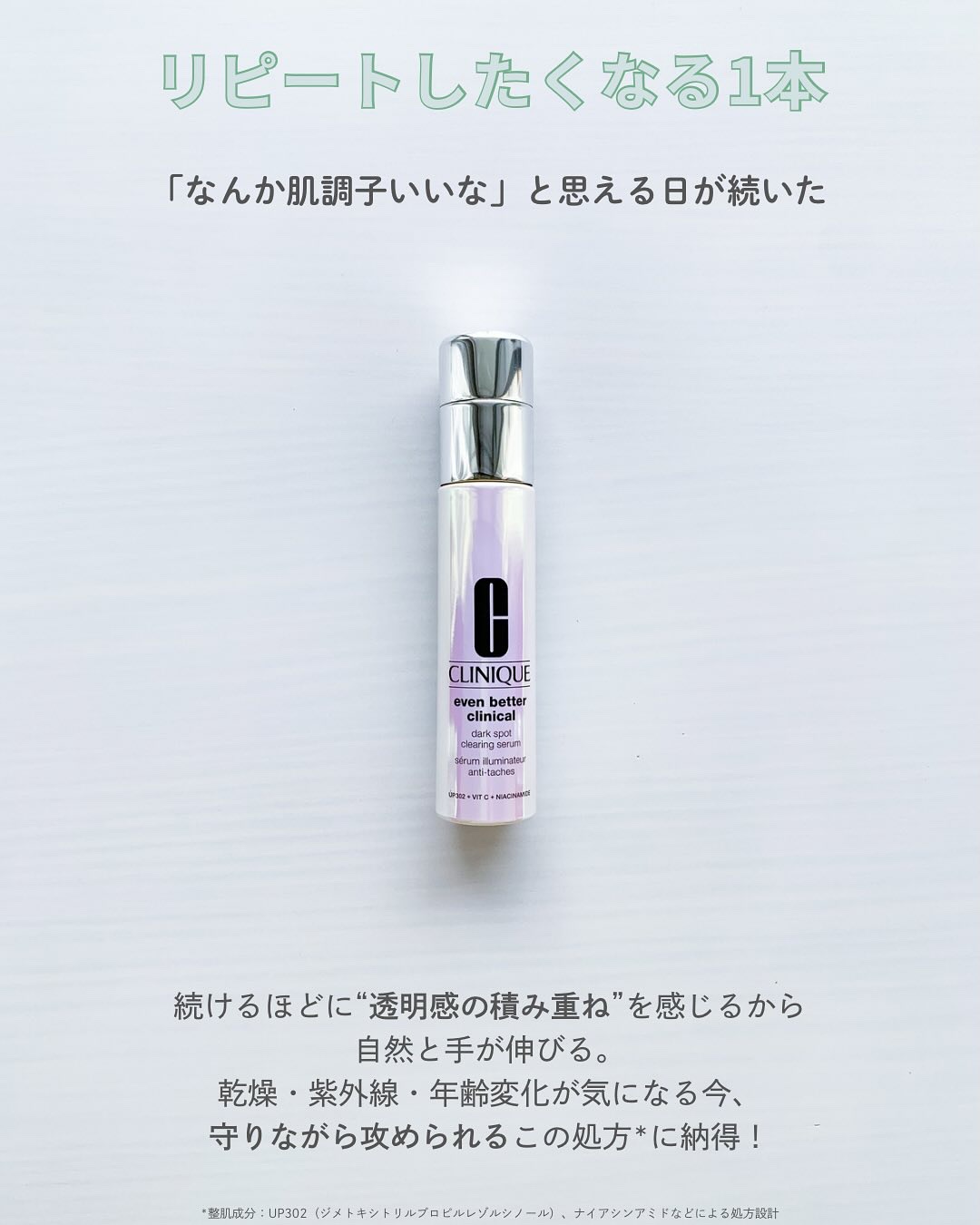 \これリピートしたくなるやつ/使ってみて実感したのは、毎日“ちゃんとケアしてる”っていう満足感と、ふと鏡を見たときの「ん?なんか明るいかも?」って小さな変化☁️˖࣪⊹透明感*¹のある白玉美肌*²へ𓂃𓈒𓏸クリニークのイーブンベターイルミネーティングブライトセラムは、なめらかな使い心地で朝晩のケアが楽しみになる美容液🧴2本目の使用で肌のトーン*¹が整ってきた感じがして、メイクのノリも変わった気が🪞ˊ˗✔軽やかでベタつかないのにうるおい感はしっかり✔角層まで浸透*³する処方で肌なじみも◎✔紫外線が気になるこれからの季節にもぴったり毎日続けたくなるのは心地よさがあるからこそ🧺🌿.∘これからも白玉美肌*²を目指してコツコツ続けてみたいアイテムです!⸻📆2025年2月14日発売クリニークイーブンベターイルミネーティングブライトセラム(医薬部外品)30mL¥10,890(税込)/50mL¥16,940(税込)⸻*¹:透明感・トーンの印象は乾燥やキメの乱れによるもの*²:白玉美肌とは、白玉のようにキメの整った明るく均一な肌のこと*³:角質層まで┈┈┈┈┈┈┈┈┈┈┈┈┈┈美白ケアマニアがスキンケアやメイクを発信中┈┈┈┈┈┈┈┈┈┈┈┈┈┈#イーブンベターイルミネーティングブライトセラム#白玉美肌美容液#美容液#クリニーク#pr#クリニークフレンズ#美白美容液#デパコススキンケア#紫外線ケア#スキンケアの衣替え#毛穴ケア#おすすめ新作#スキンケア#乾燥肌#美白ケア