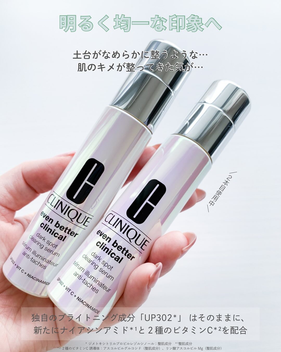CLINIQUE「イーブン ベター シリーズ」!美白*ラインの美白美容液がこの春リニューアルするんです👒🌷⸒⸒ 独自ブライトニング成分「UP302*²」はそのままに新たに「2種のビタミンC*³」と「ナイアシンアミド(整肌成分)」の攻めの成分を新配合! 攻め×守りのWアプローチが透明感の循環**を作ってくれるみたい👩⚕️
