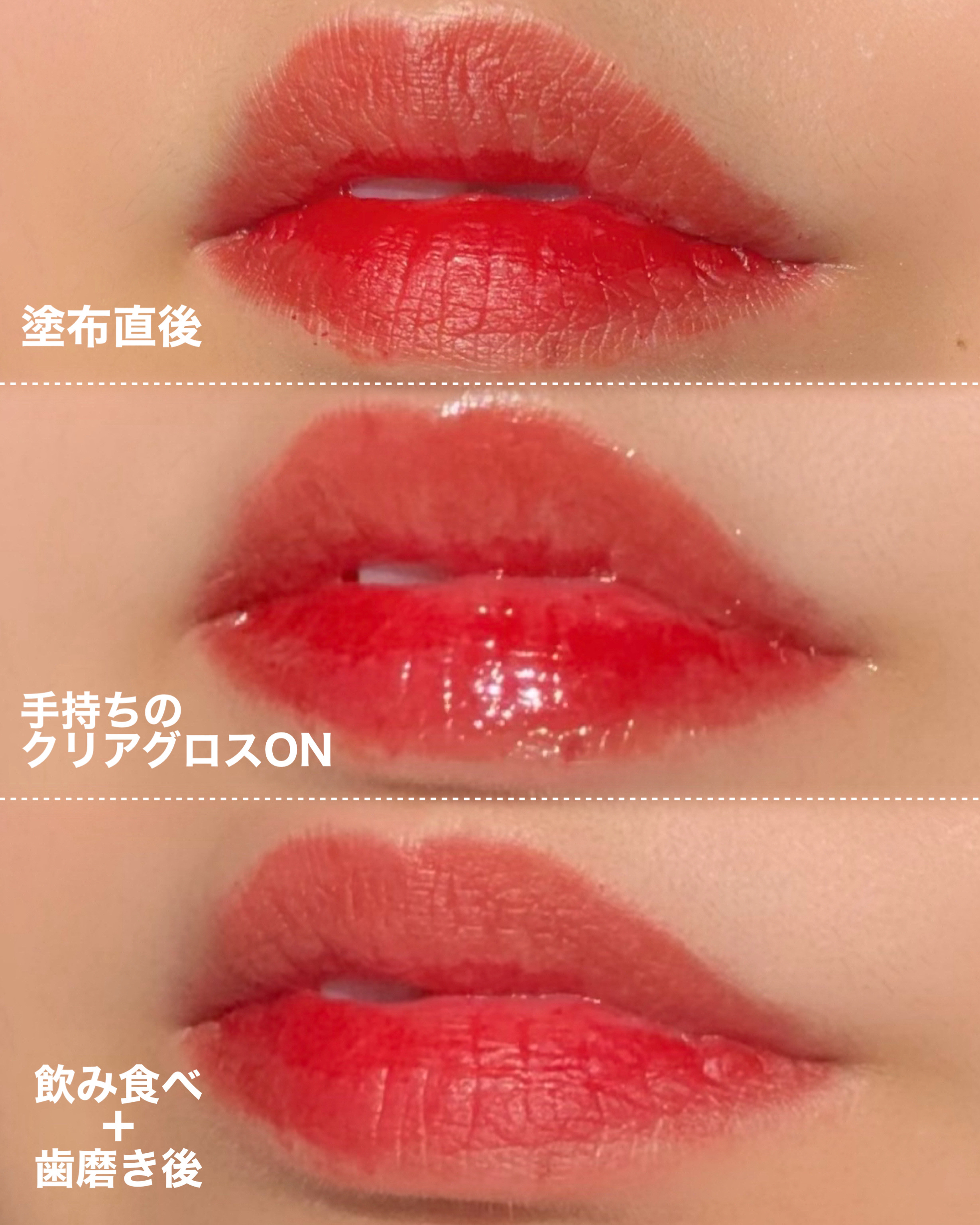 驚くほど鮮やかな発色力と持久力とを備えたリップとなっており、塗った瞬間に生き返る唇のボリューム感まで✨ 健康な唇維持のための栄養&保湿ケアを叶えてくれるアイテムなんだそう。 フィルムを剥がすとほんのりレッドカラーに色づいてくれて、食べたり飲んだりしても落ちないから、長時間お直しが出来ない時にも血色感のあるお色味をキープしてくれます。