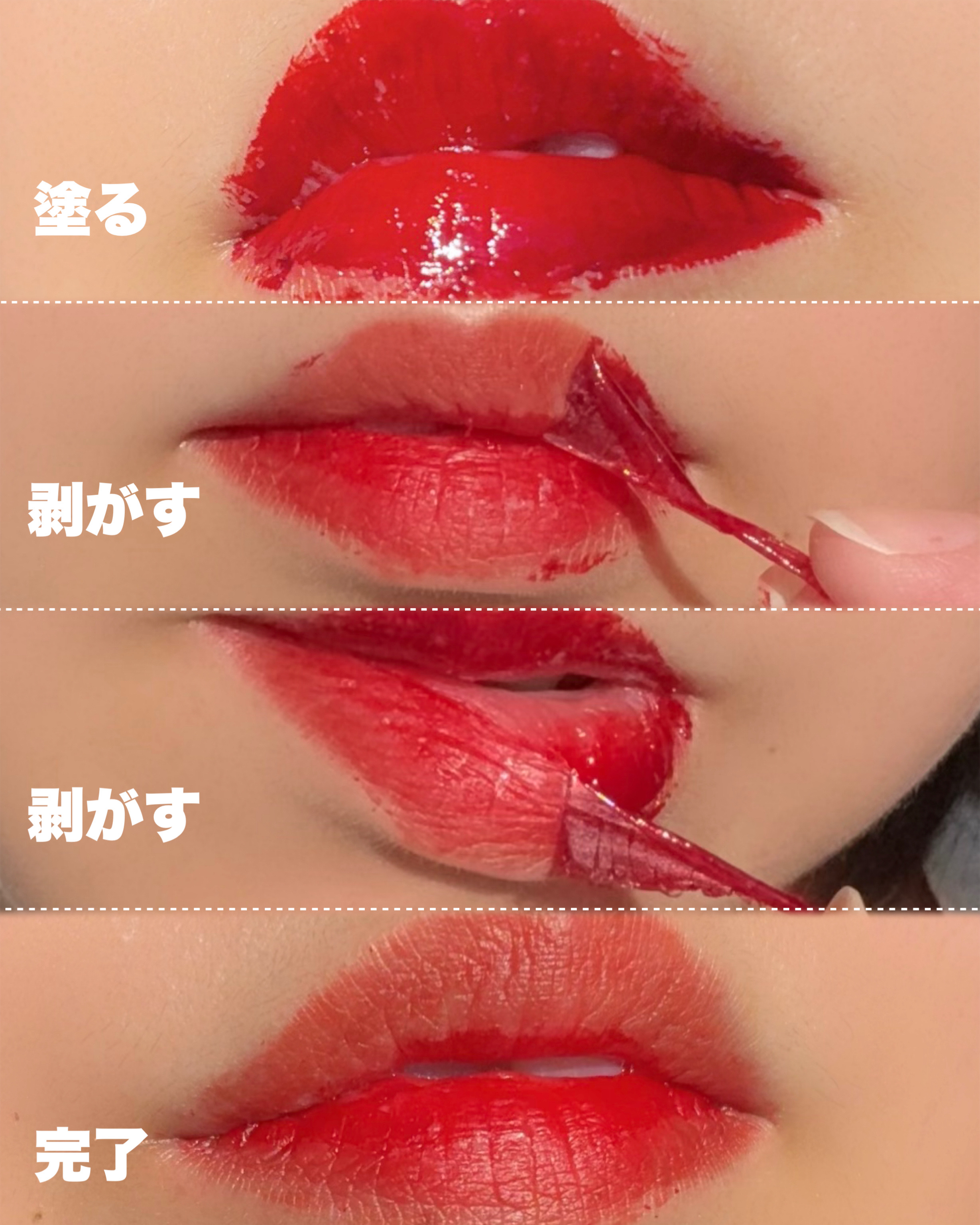 何とこのティント、剥がせるんです。 しっかり乾いたら端から唇に沿って優しくゆっくりと剥がします。そうすると。。。しっかりと綺麗に色づいてくれて、カラーがピタッと密着。 飲み物を飲んでもなかなか落ちないです。すごい! カラバリもパケもオシャレでイチオシのリップです。