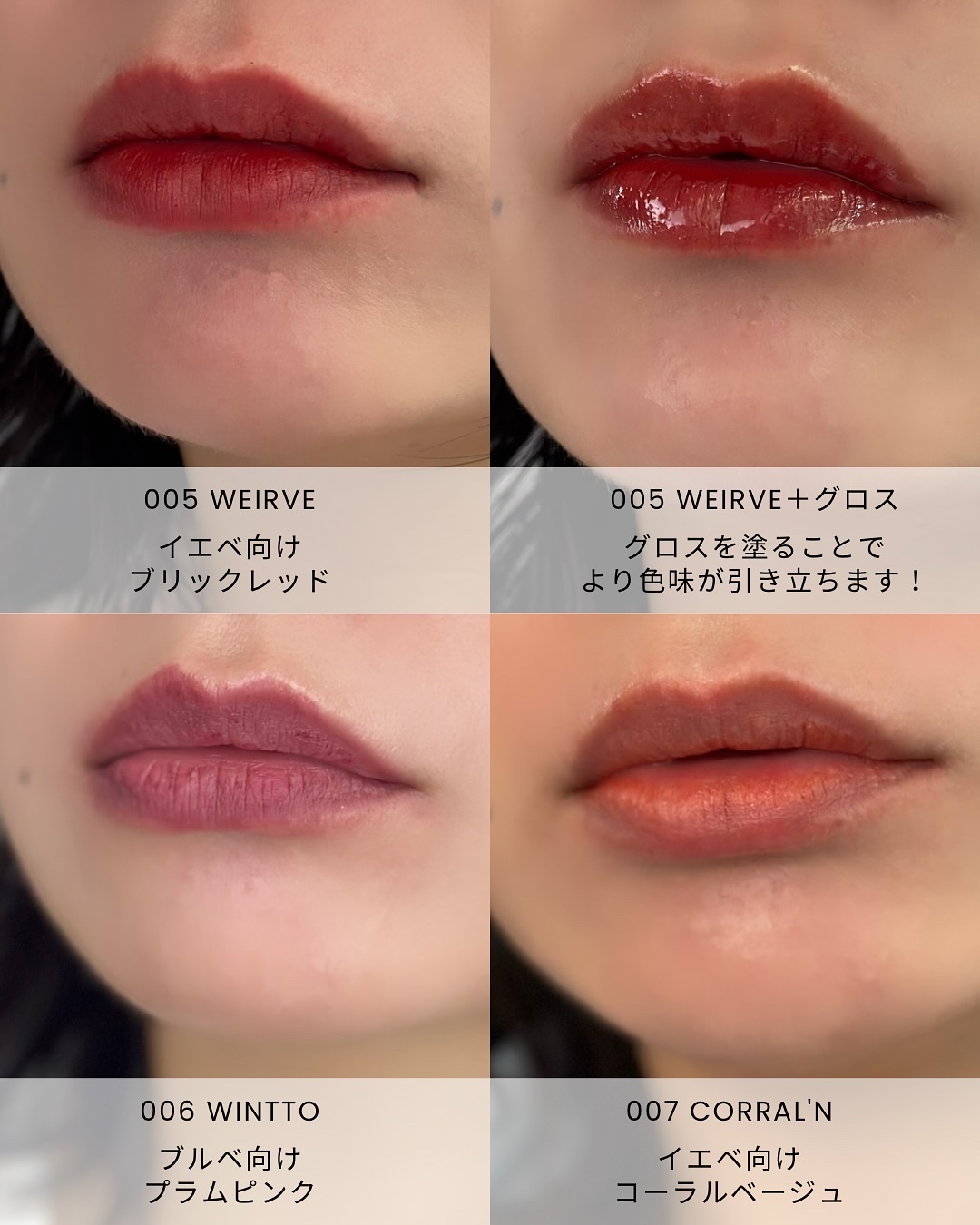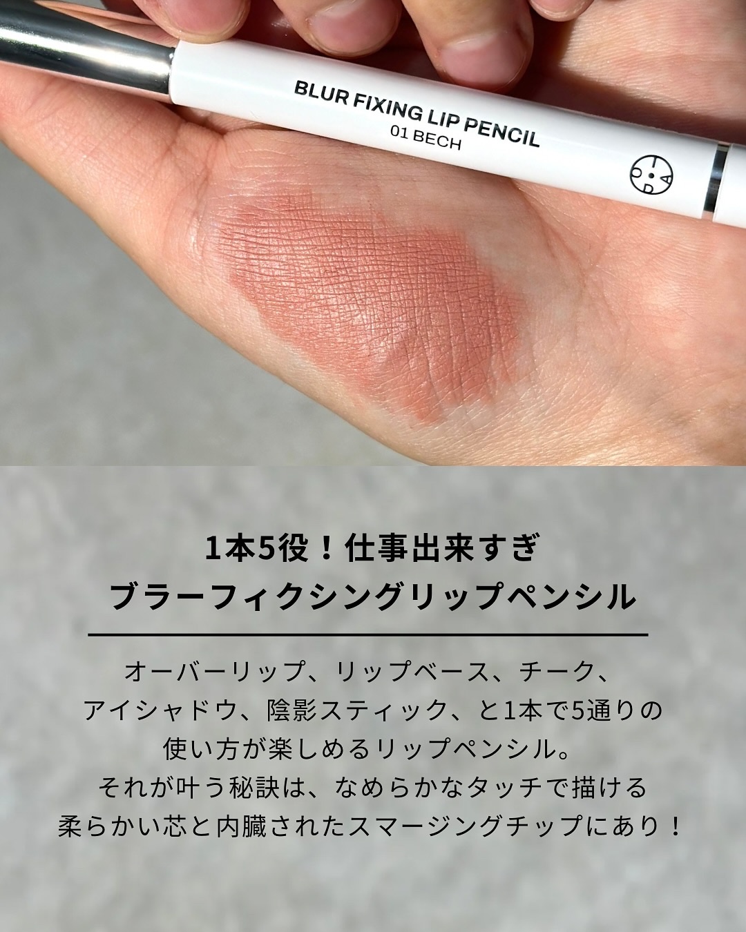 #PR#OiadOiad.BLURFIXINGLIPPENCIL01BECHリップティーク003BLUNTO005WEIRVE007CORRAL’Nリップペンシルはなめらかな書き心地でベースリップとしても。01は肌馴染みのいいカラー。リップテ...