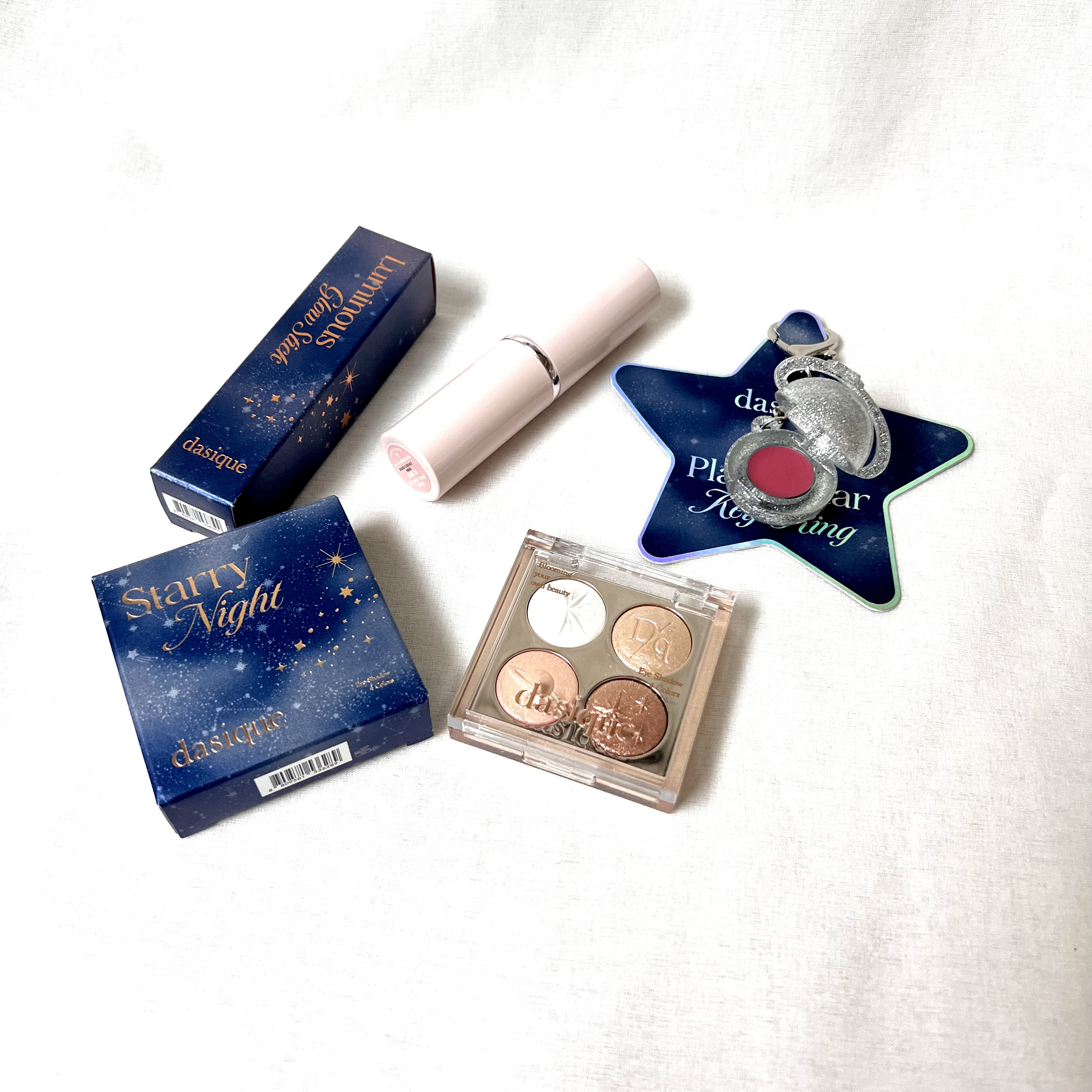スターリーナイト シャドウパレット✨ 01 ムーンライト 月明かりグリッターがたーっぷり詰め込まれたプリズムシャドウパレット😍 使うの躊躇うくらい可愛い🥹❤️ ジューシーデュイティント✨ 27 Sugar Roll ピーチベージュ🍑 ベージュ感もっと強いかなって思ってたけど時間が経つと少し赤みが増す?🤔✨ おまけのキーリングもすんごい可愛いよ✨ まだメイク出来てないから早く使うの楽しみ♥️