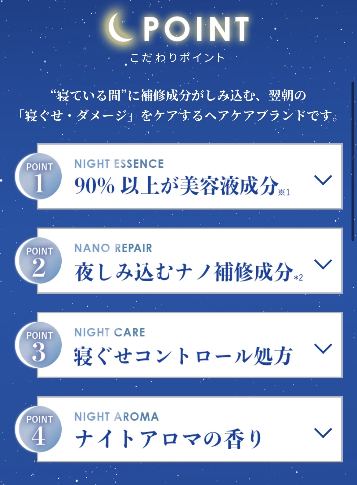 - ①90%以上が美容液成分※1 ナイトスリーク原料*5や高浸透ケラチン*6を配合。うねりの原因である地肌にアプローチします。 ※1:基剤を除く、水を含む *1:加水分解シルク、アルギニン、セラミドNG(全て保湿) *5:月見草油、ケラチン(羊毛)(全て保湿) *6:加水分解ケラチン(羊毛)(保湿) *7:ベントナイト、海シルト(全て保湿) ○画像・イラストは全てイメージです。 ②夜しみ込むナノ美容液成分*1 ナノシルク*2、ナノアミノ酸*3、ナノセラミド*4を配合。寝ている間にナノ化した美容液成分*1が浸透し、頭皮の蒸れや摩擦を抑制します。 *1:加水分解シルク、アルギニン、セラミドNG(全て保湿) *2:加水分解シルク(保湿) *3:アルギニン(保湿) *4:セラミドNG(保湿) ○画像・イラストは全てイメージです。 ③ナイトスリーク処方 ナイトスリーク処方を採用することで、地肌からうねりを抑制し、翌朝サラサラ髪へ導きます。 ④ナイトアロマの香り リラックス感を与え、就寝前に楽しむ香りとしておすすめであるネロリや華やかなホワイトローズなど、シリーズ毎に異なるナイトアロマの香りで心地良い眠りに導きます。