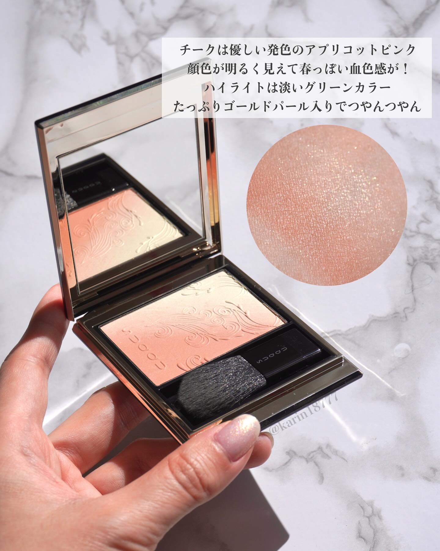 もはやこれはコスメと言うより芸術作品なんよ…こんな美しい刻印のチークある?? 淡いベージュカラーだからニュアンスチェンジとしても使えるしチークレスなメイクに仕上げたい時はハイライト部分だけ頬にふわっと入れても良さそう