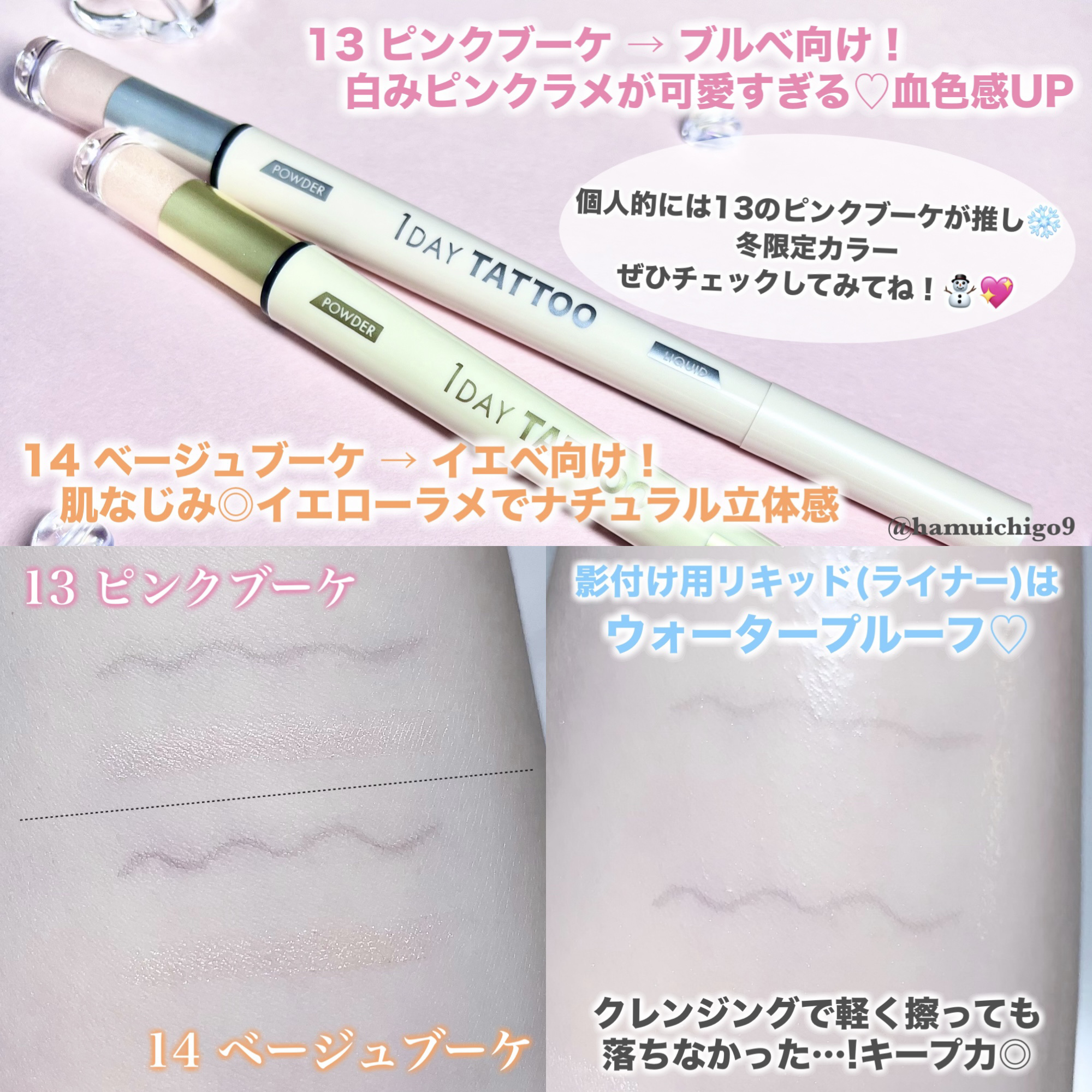 \冬限定カラー登場❄️/まるで雪どけツヤ影!?💖Kパレット「マルチブルーミングアイズ」から冬限定カラーが登場!可愛すぎたからレビューするね✨┈┈┈┈┈┈┈┈┈┈┈┈┈┈┈┈┈💐冬限定カラー2色13ピンクブーケ血色感プラス♡ふんわり甘めの澄みツヤピンク14ベージュブーケ光をまとった立体感✨ナチュラルに盛れるヌードベージュ┈┈┈┈┈┈┈┈┈┈┈┈┈┈┈┈┈\1本でうるつや涙袋!/☑うるツヤパウダー(アイシャドウ)❄︎5種の微細パールで繊細な輝き✨密着力◎❄︎涙袋・眉下・鼻筋ハイライトにも使える!❄︎8種の美容保湿成分入り☑影付け用リキッド(ライナー)❄︎極細ショート筆でブレにくく描きやすい!❄︎ウォータープルーフで長時間キープ🤍❄︎涙袋の影・ふたえライン・ノーズシャドウ・人中短縮など使い方無限大!┈┈┈┈┈┈┈┈┈┈┈┈┈┈┈┈┈✦使ってみた感想🫧💗13ピンクブーケ→ブルベ向け!白みピンクラメが可愛すぎる♡血色感UP!💛14ベージュブーケ→イエベ向け!肌なじみ◎イエローラメでナチュラルに立体感✨個人的には13のピンクブーケが推し❄️冬限定カラー、ぜひチェックしてみてね!⛄💖┈┈┈┈┈┈┈┈┈┈┈┈┈┈┈┈┈#PR#提供#Kパレット#マルチブルーミングアイズ#ピンクブーケ#ベージュブーケ#涙袋#アイシャドウ