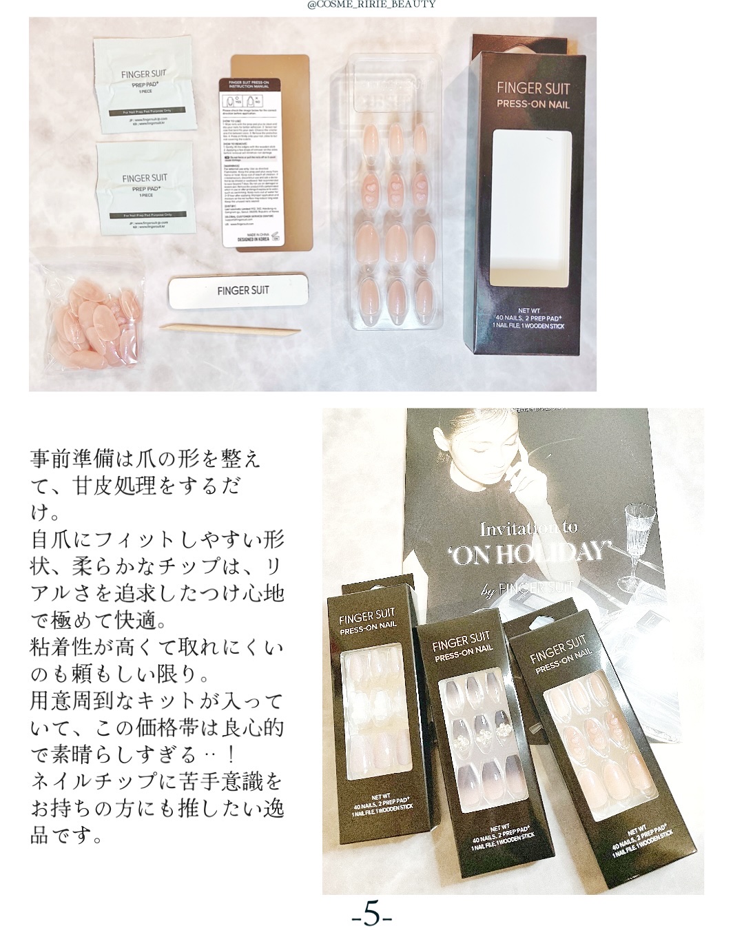 ✼••┈┈••✼••┈┈••✼••┈┈••✼••┈┈••✼ FINGERSUITWarmHug InMyHeart EveningSky✼••┈┈••✼••┈┈••✼••┈┈••✼••┈┈••✼K-popアイドル愛用のネイルブランド💅 FINGERSUIT/ネイルチップのシールタイプを3つ頂きました!InMyHeartデザインに一目惚れ❤︎1番使ってみたかったチップ!WarmHugゆめかわカラーでクマちゃんデザインがキュートEveningSky大人っぽくラグジュアリーなイメージ中には日本語説明書つきで、チップ40枚、油分をとるパッド2枚、ミニファイル1つ、ウッドスティック1本入りチップをつけようと思い立った時にすぐネイルできちゃう!普段ネイルができないから休日にはチップでネイルを楽しみたい❤︎着る服でネイル変えたい時にもすぐ変えられる!シールタイプだけでなく、グルーでもシールでもOKなリユーザブルタイプもポリッシュもあるのも魅力的✨今回はInMyHeartを使ってみました!長時間水に濡れるのには気を遣っていたのもあるのか、お風呂入ってもチップが取れる気配なし!寝てる間も大丈夫!シールが強力+プレップパッドプラスにフィックス効果があるみたい!5〜7日で外すことを推奨してるみたいなので、次のチップはそのくらいもつのか試してみたいと思います!!その後EveningSkyを試しました!3日しか付けられず、つけたあと結構爪の先に負担かけたりもしましたが、取れることはなかったです。#PR#フィンガースーツ#FINGERSUIT#LIPSプレゼント#WarmHug#InMyHeart#EveningSky