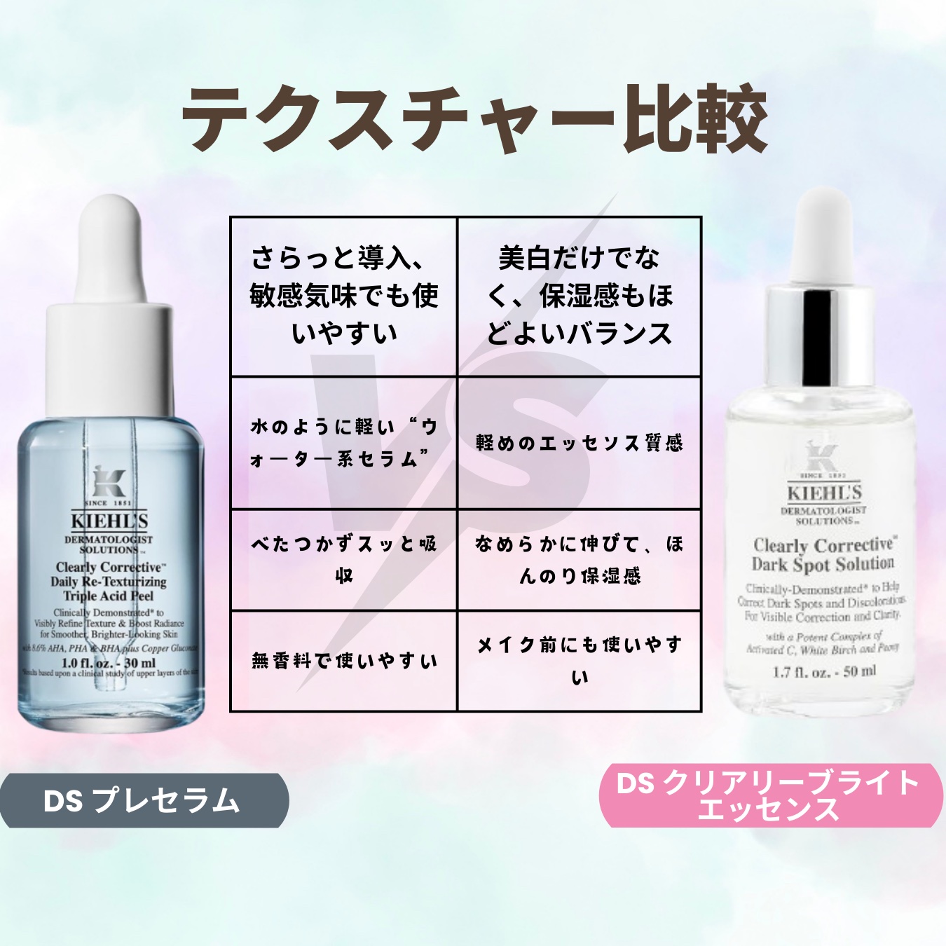 📸✨【キールズ2大美容液比較レビュー】毛穴ケア派?透明感派?どっちが合う?💭🌿💧①DSプレセラム(導入×角質ケア)水みたいに軽い“さらさらピールセラム”。AHA/BHA/PHAの3種の酸で、ざらつき・黒ずみ・毛穴の影を速攻ケア。使った次の日、...